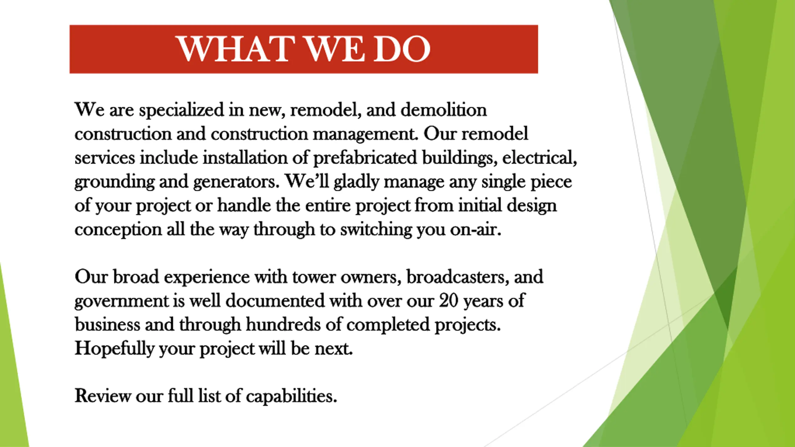 WHAT WE DO WHAT WE DO We are specialized in new, remodel, and demolition We are specialized in new, remodel, and demolition construction and construction management. Our remodel construction and construction management. Our remodel services include installation of prefabricated buildings, electrical, services include installation of prefabricated buildings, electrical, grounding and generators. We ll gladly manage any single piece grounding and generators. We ll gladly manage any single piece of your project or handle the entire project from initial design of your project or handle the entire project from initial design conception all the way through to switching you on conception all the way through to switching you on- -air. air. Our broad experience with tower owners, broadcasters, and Our broad experience with tower owners, broadcasters, and government is well documented with over our 20 years of government is well documented with over our 20 years of business and through hundreds of completed projects. business and through hundreds of completed projects. Hopefully your project will be next. Hopefully your project will be next. Review our full list of capabilities. Review our full list of capabilities.