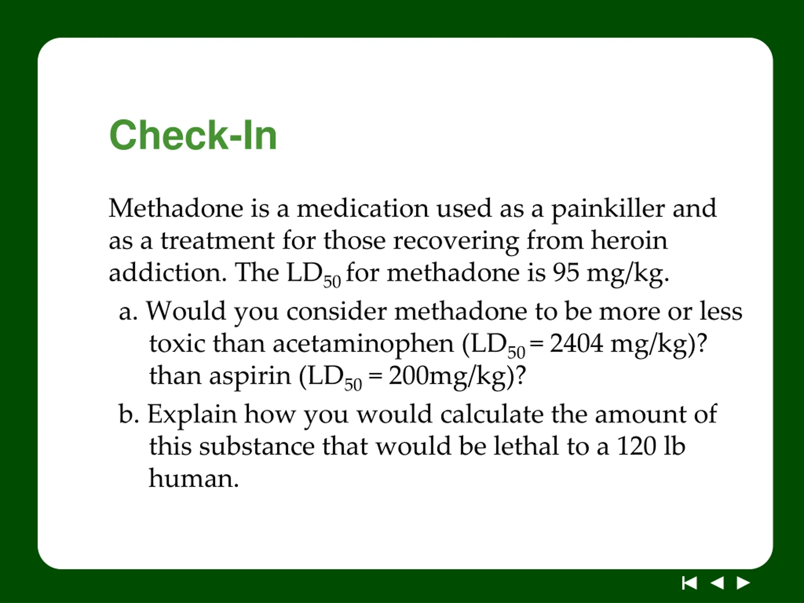 Check-In Methadone is a medication used as a painkiller and as a treatment for those recovering from heroin addiction. The LD50 for methadone is 95 mg/kg. a. Would you consider methadone to be more or less toxic than acetaminophen (LD50 = 2404 mg/kg)? than aspirin (LD50= 200mg/kg)? b. Explain how you would calculate the amount of this substance that would be lethal to a 120 lb human.