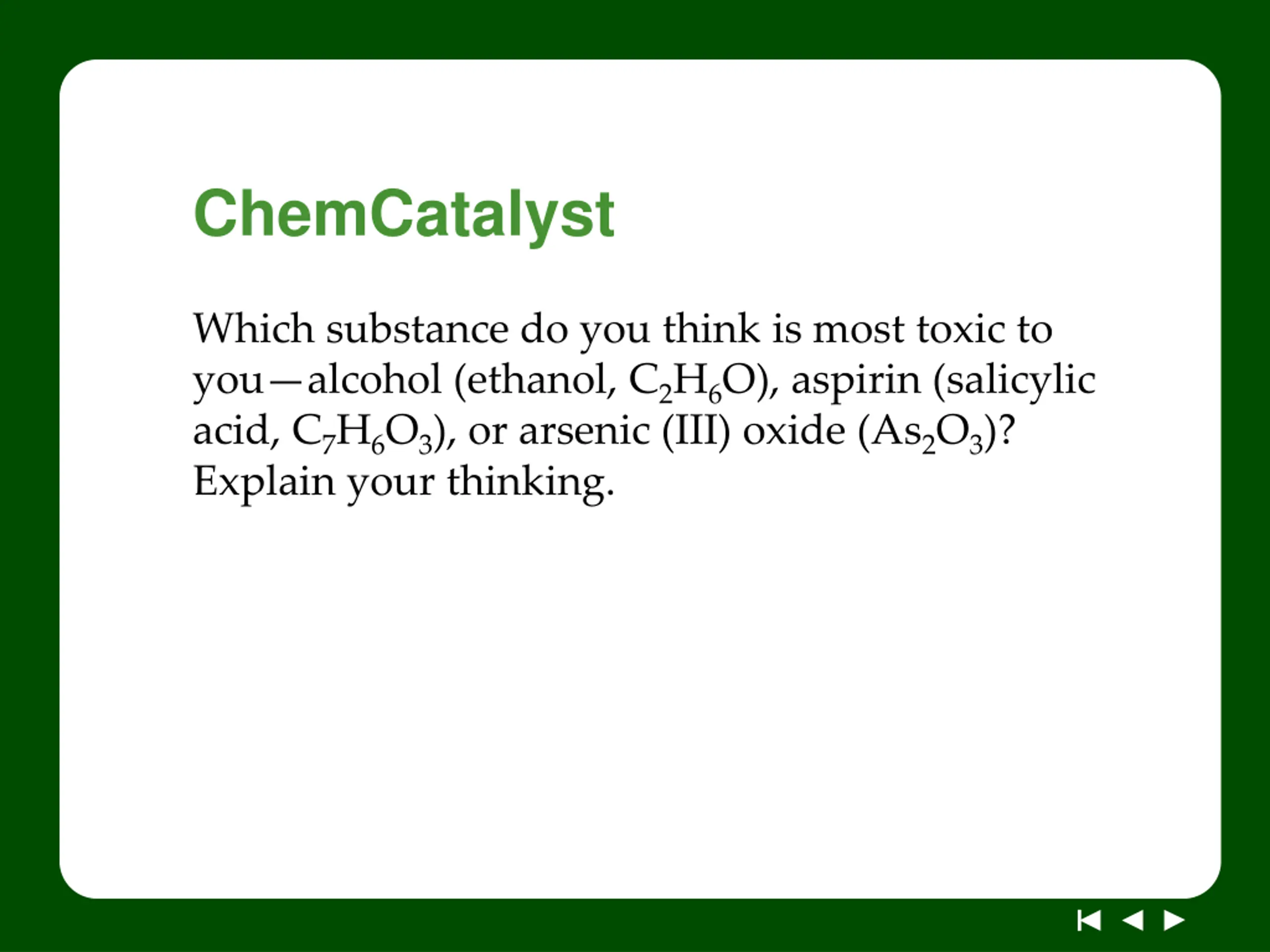 ChemCatalyst Which substance do you think is most toxic to you alcohol (ethanol, C2H6O), aspirin (salicylic acid, C7H6O3), or arsenic (III) oxide (As2O3)? Explain your thinking.