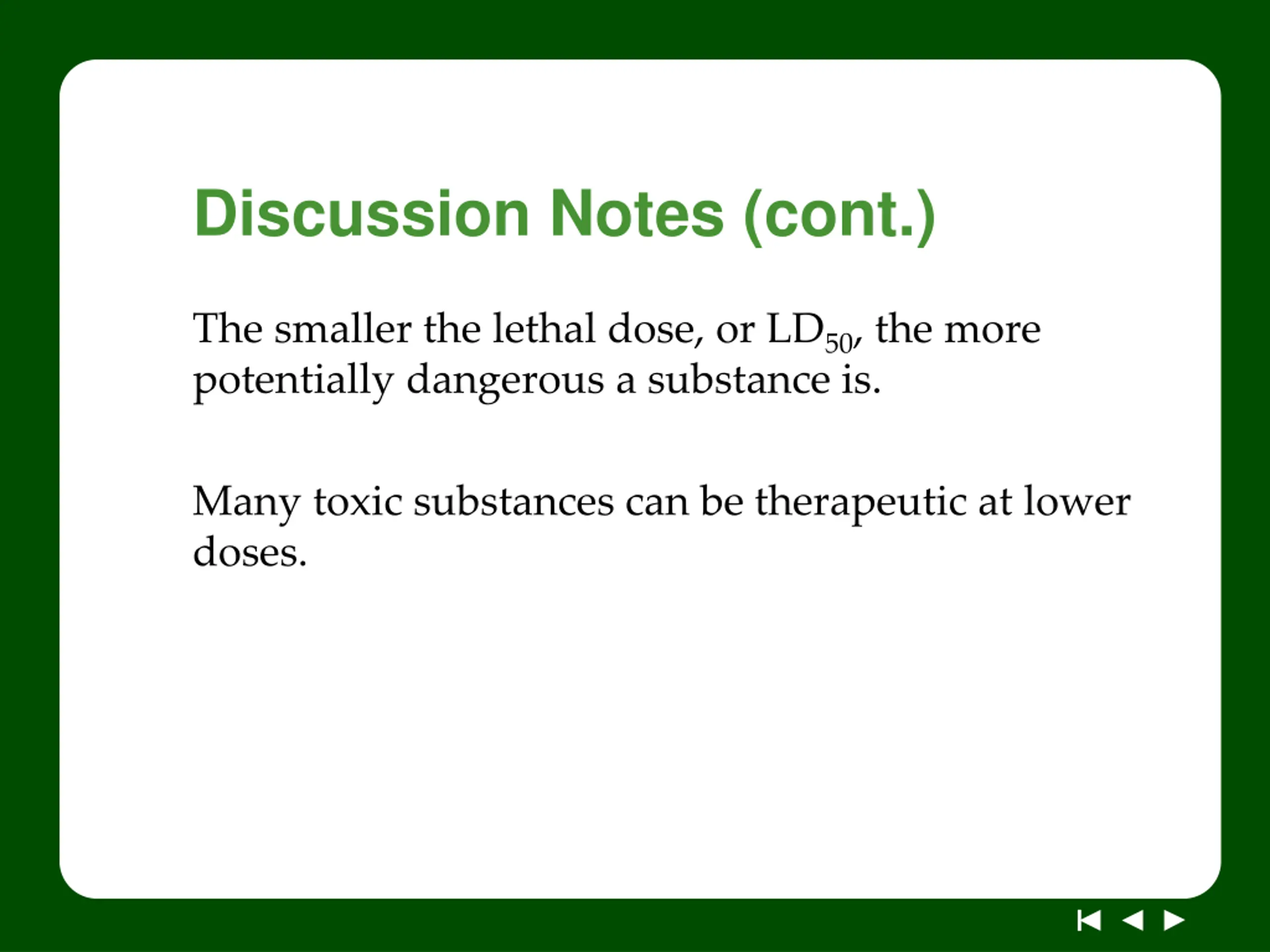 Discussion Notes (cont.) The smaller the lethal dose, or LD50, the more potentially dangerous a substance is. Many toxic substances can be therapeutic at lower doses.