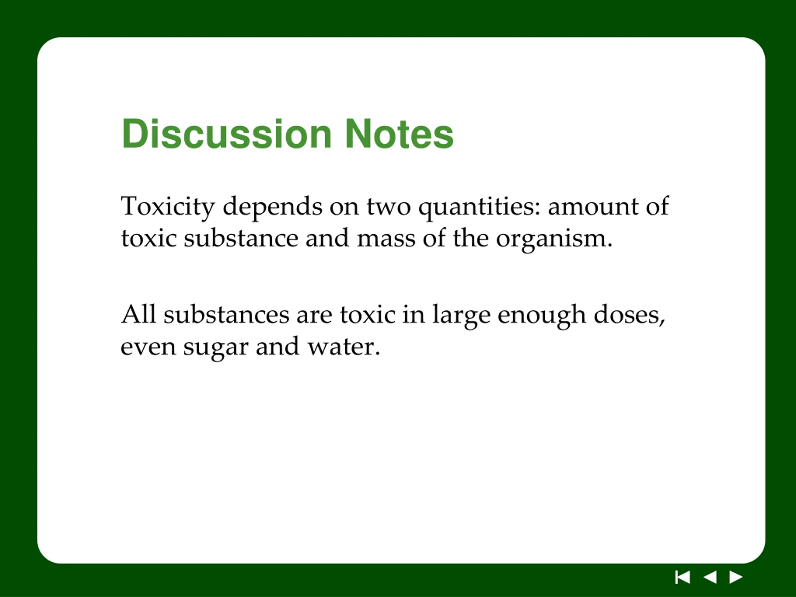 Discussion Notes Toxicity depends on two quantities: amount of toxic substance and mass of the organism. All substances are toxic in large enough doses, even sugar and water.