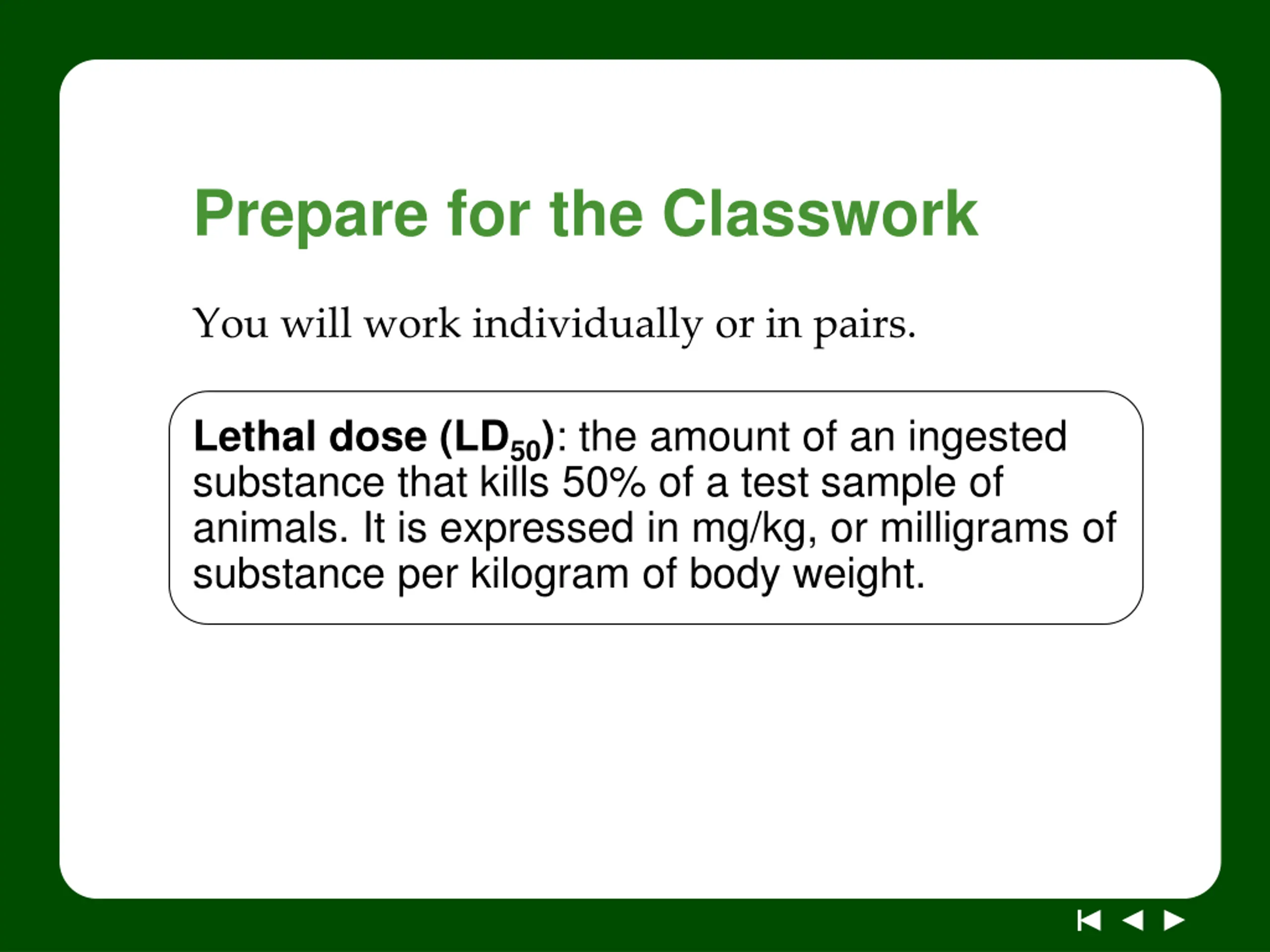 Prepare for the Classwork You will work individually or in pairs. Lethal dose (LD50): the amount of an ingested substance that kills 50% of a test sample of animals. It is expressed in mg/kg, or milligrams of substance per kilogram of body weight.