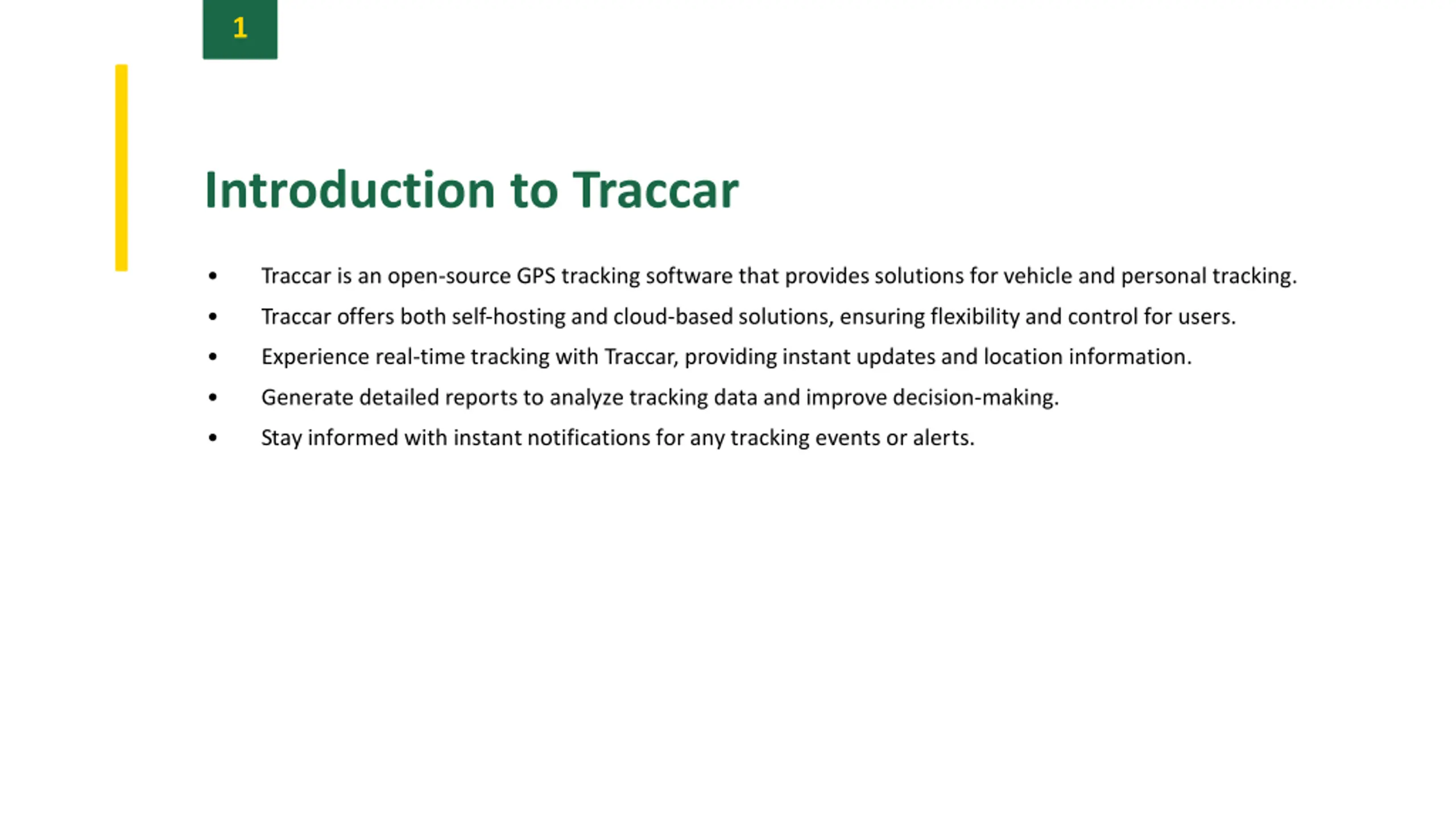 1 Introduction to Traccar Traccar is an open-source GPS tracking software that provides solutions for vehicle and personal tracking. Traccar offers both self-hosting and cloud-based solutions, ensuringflexibility and control for users. Experience real-time tracking with Traccar, providing instant updates and location information. Generate detailed reports to analyze tracking data and improve decision-making. Stay informed with instant notifications for any tracking events or alerts.