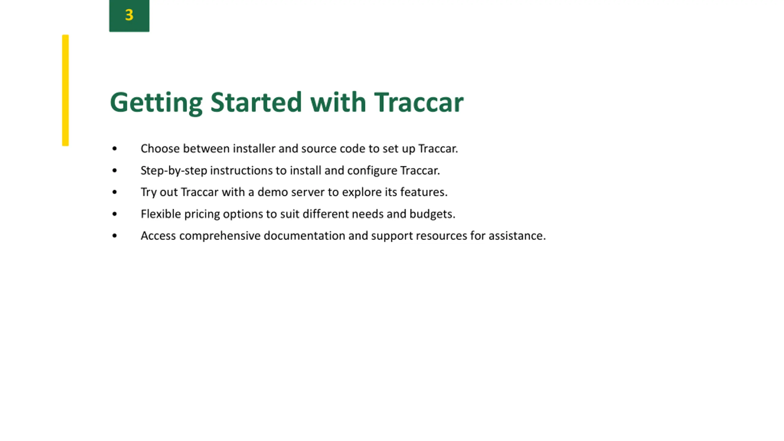 3 Getting Started with Traccar Choose between installer and source code to set up Traccar. Step-by-stepinstructions to install and configure Traccar. Try out Traccar with a demo server to explore its features. Flexible pricing options to suit differentneeds and budgets. Access comprehensive documentation and supportresources for assistance.