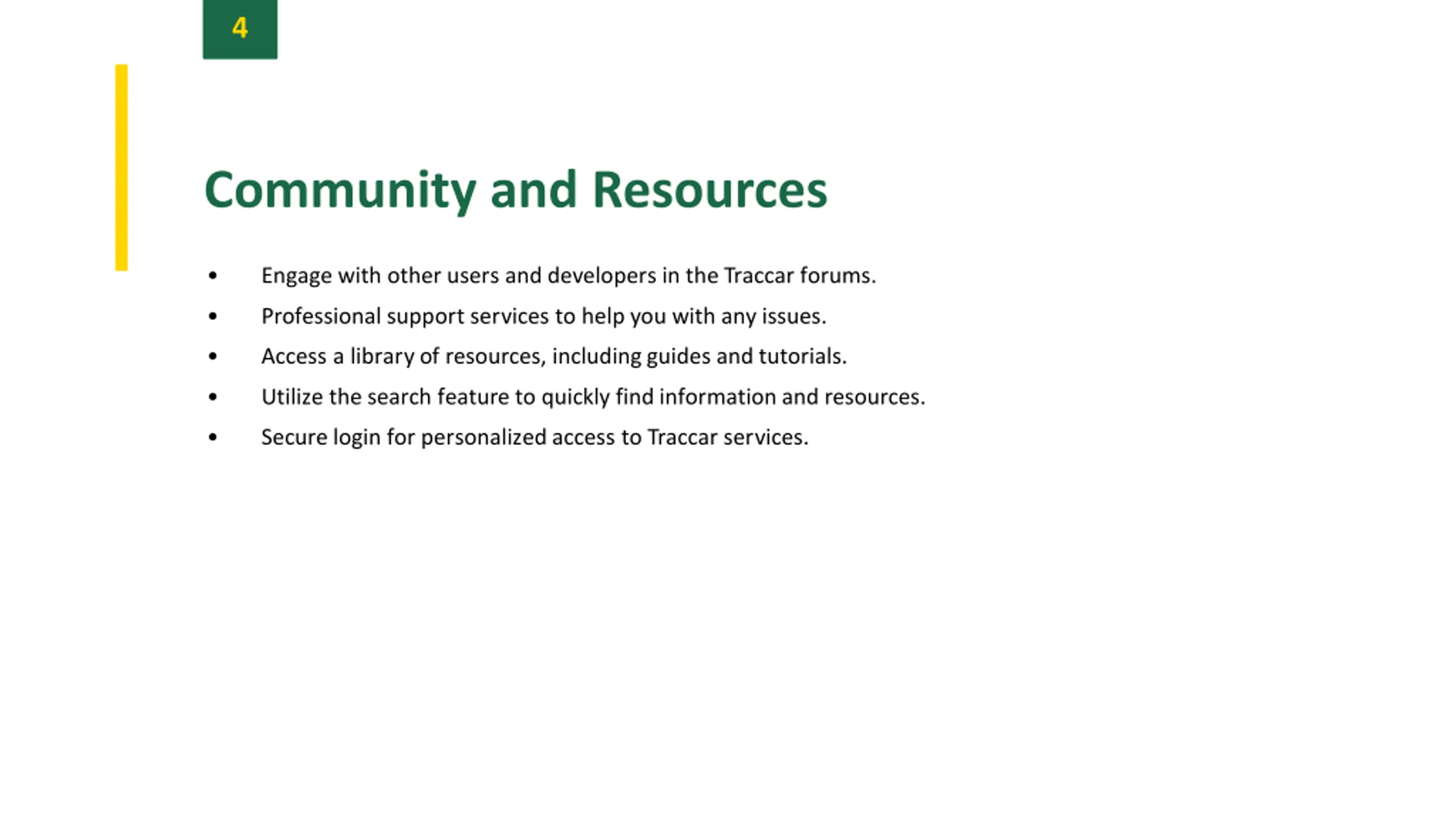 4 Community and Resources Engage with other users and developers in the Traccar forums. Professional support services to help you with any issues. Access a libraryof resources, including guides and tutorials. Utilize the search feature to quickly find information and resources. Secure login for personalized access to Traccar services.