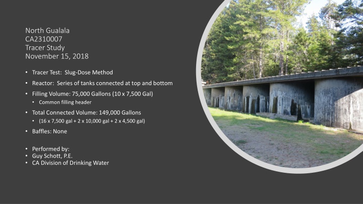 North Gualala CA2310007 Tracer Study November 15, 2018 Tracer Test: Slug-Dose Method Reactor: Series of tanks connected at top and bottom Filling Volume: 75,000 Gallons (10 x 7,500 Gal) Common filling header Total Connected Volume: 149,000 Gallons (16 x 7,500 gal + 2 x 10,000 gal + 2 x 4,500 gal) Baffles: None Performed by: Guy Schott, P.E. CA Division of Drinking Water