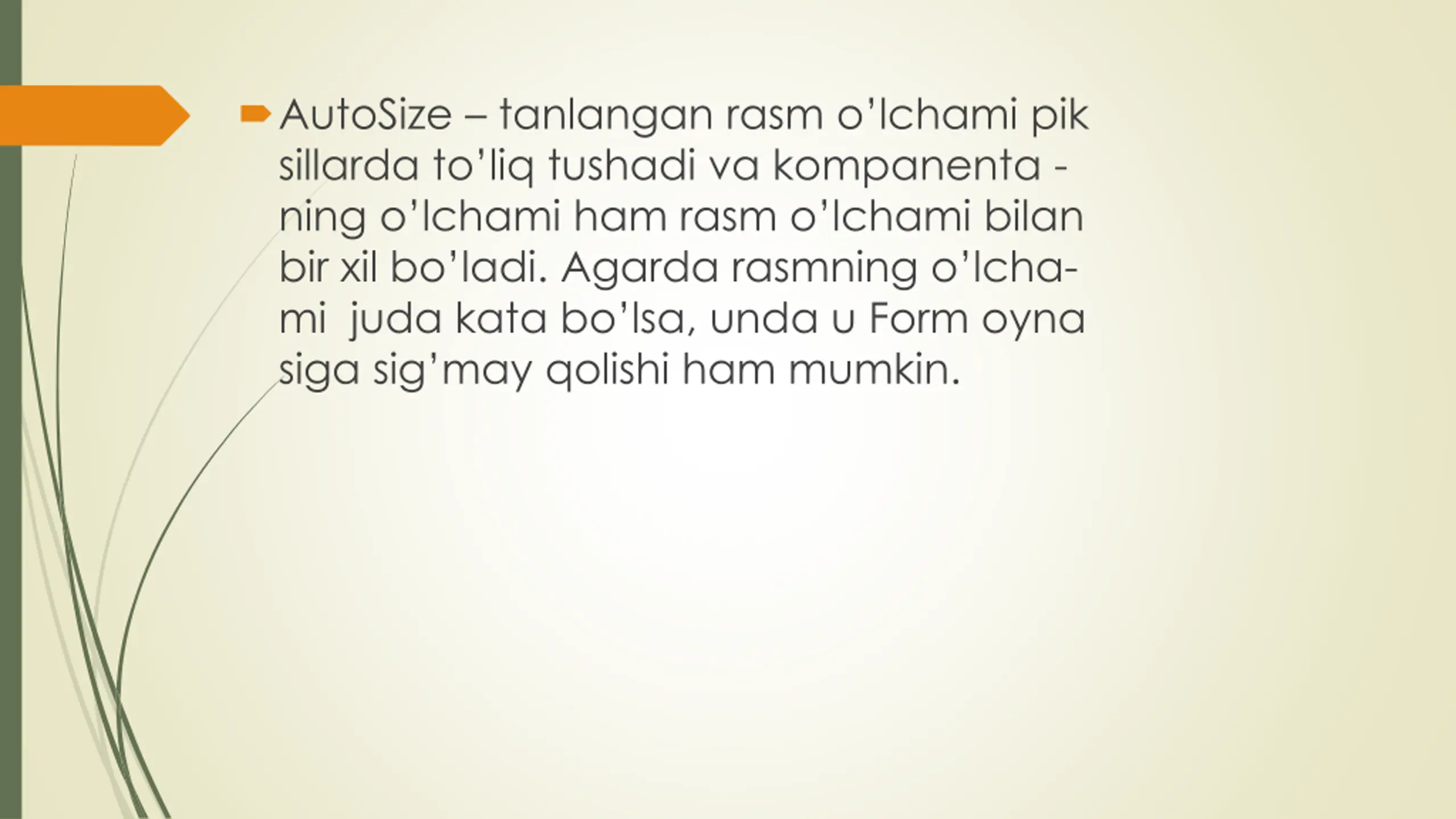 AutoSize tanlangan rasm olchami pik sillarda to liq tushadi va kompanenta - ning o lchami ham rasm o lchami bilan bir xil bo ladi. Agarda rasmning o lcha- mi juda kata bo lsa, unda u Form oyna siga sig may qolishi ham mumkin.