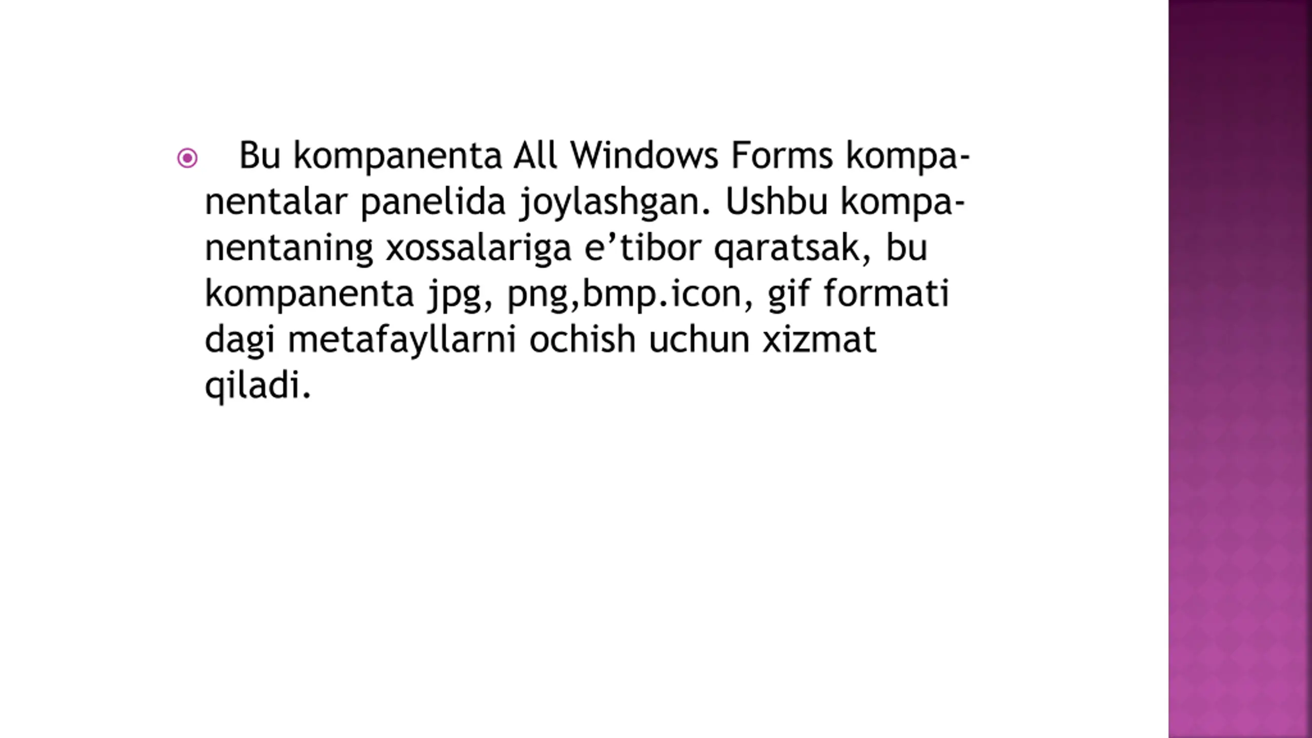 Bu kompanenta All Windows Forms kompa- nentalar panelida joylashgan. Ushbu kompa- nentaning xossalariga e tibor qaratsak, bu kompanenta jpg, png,bmp.icon, gif formati dagi metafayllarni ochish uchun xizmat qiladi.