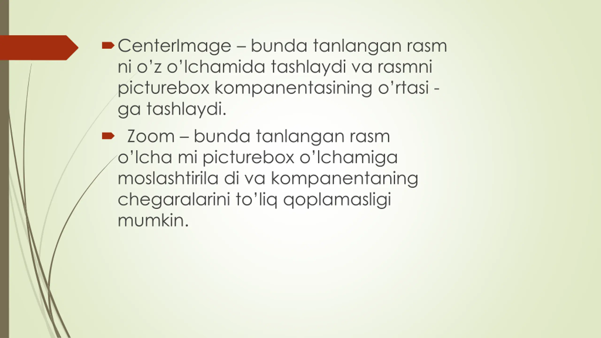 CenterImage bunda tanlangan rasm ni o z o lchamida tashlaydi va rasmni picturebox kompanentasining o rtasi - ga tashlaydi. Zoom bunda tanlangan rasm o lcha mi picturebox o lchamiga moslashtirila di va kompanentaning chegaralarini to liq qoplamasligi mumkin.