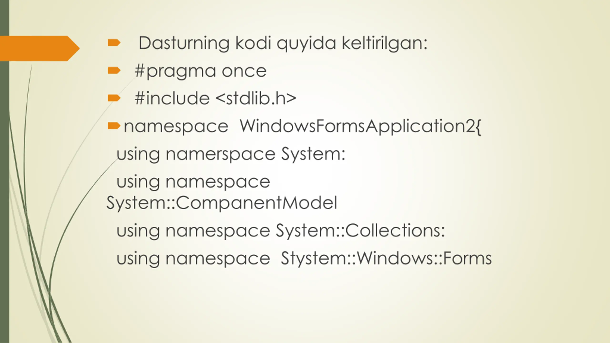 Dasturning kodi quyida keltirilgan: #pragma once #include <stdlib.h> namespace WindowsFormsApplication2{ using namerspace System: using namespace System::CompanentModel using namespace System::Collections: using namespace Stystem::Windows::Forms
