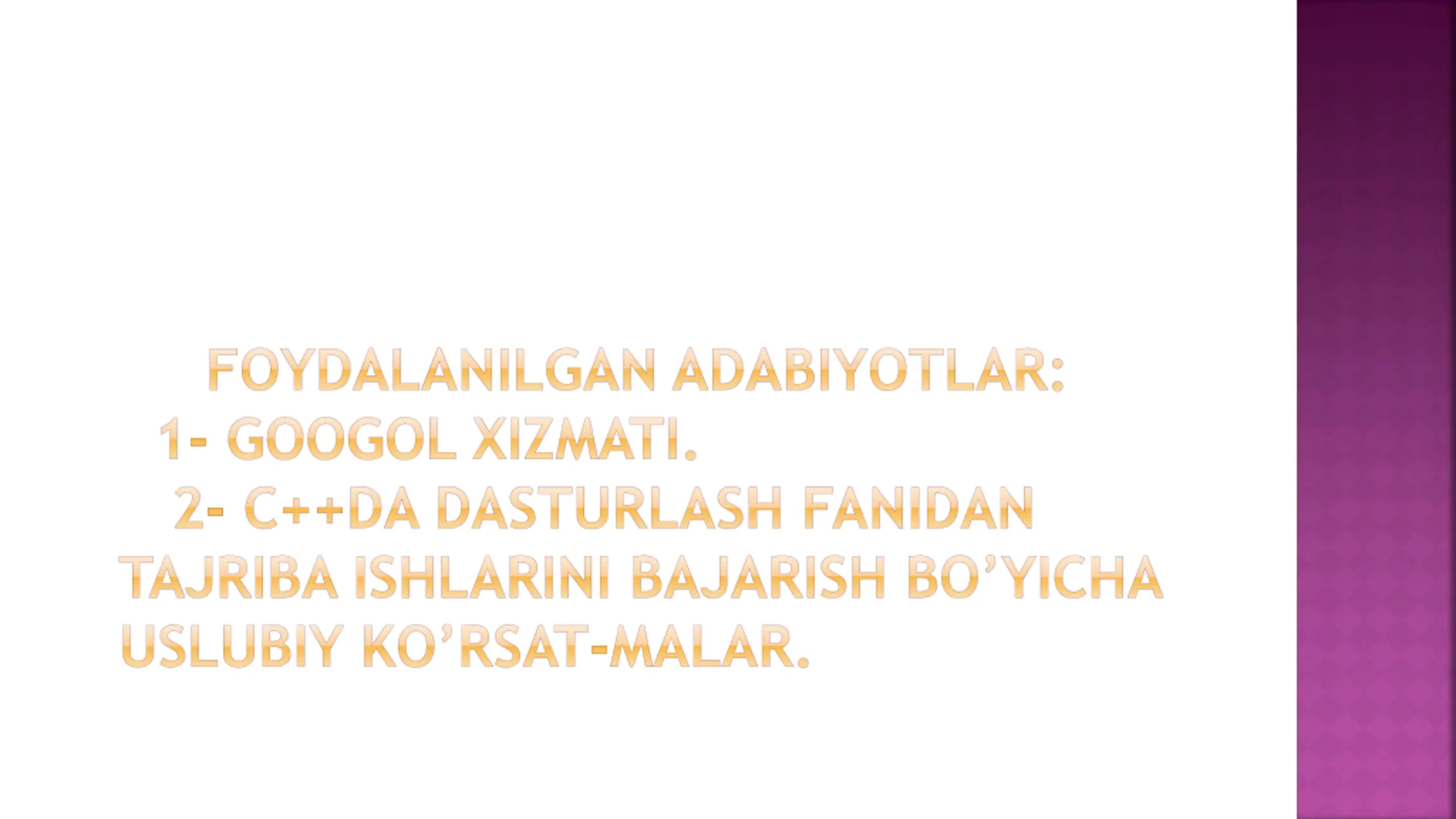 FOYDALANILGAN ADABIYOTLAR: 1- GOOGOL XIZMATI. 2- C++DA DASTURLASH FANIDAN TAJRIBA ISHLARINI BAJARISH BO YICHA USLUBIY KO RSAT-MALAR.