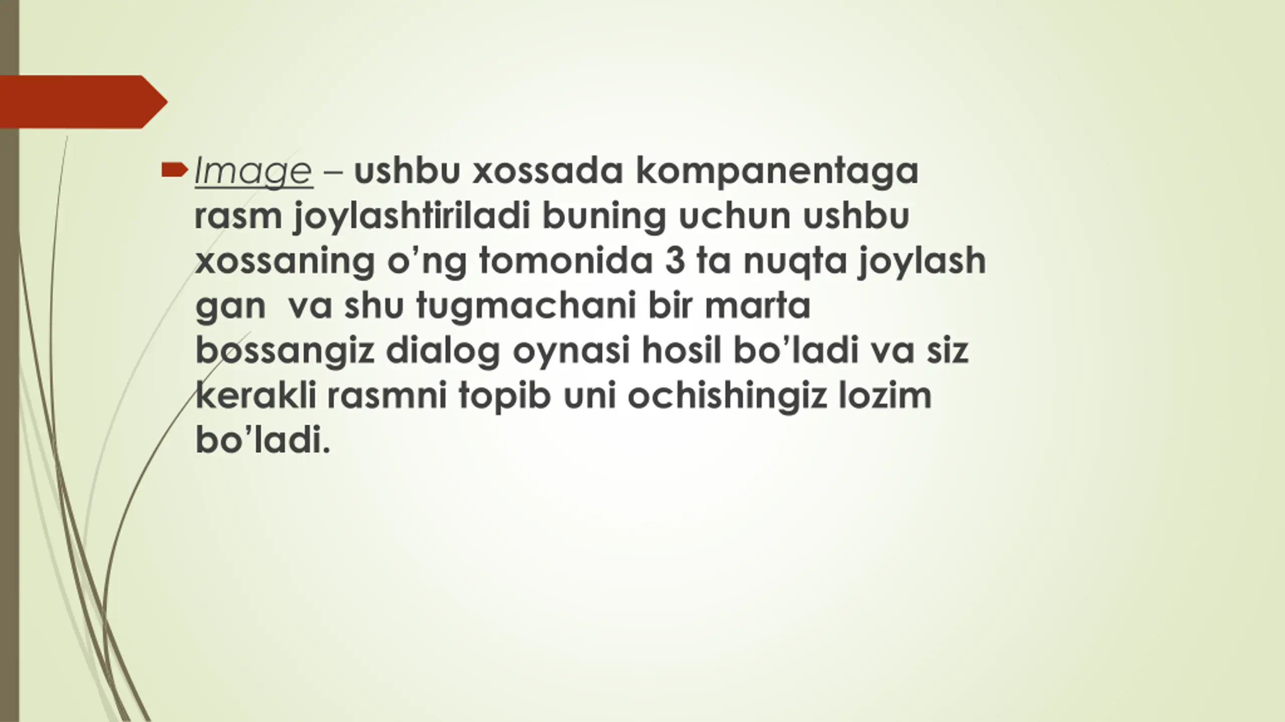 Image ushbu xossada kompanentaga rasm joylashtiriladi buning uchun ushbu xossaning o ng tomonida 3 ta nuqta joylash gan va shu tugmachani bir marta bossangiz dialog oynasi hosil bo ladi va siz kerakli rasmni topib uni ochishingiz lozim bo ladi.