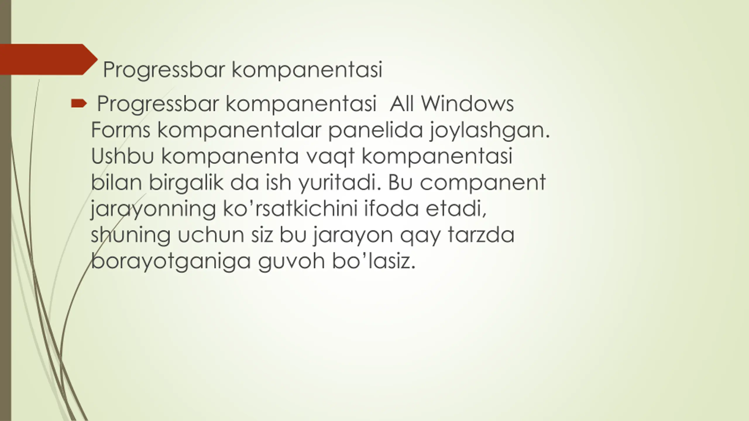 Progressbar kompanentasi Progressbar kompanentasi All Windows Forms kompanentalar panelida joylashgan. Ushbu kompanenta vaqt kompanentasi bilan birgalik da ish yuritadi. Bu companent jarayonning ko rsatkichini ifoda etadi, shuning uchun siz bu jarayon qay tarzda borayotganiga guvoh bo lasiz.