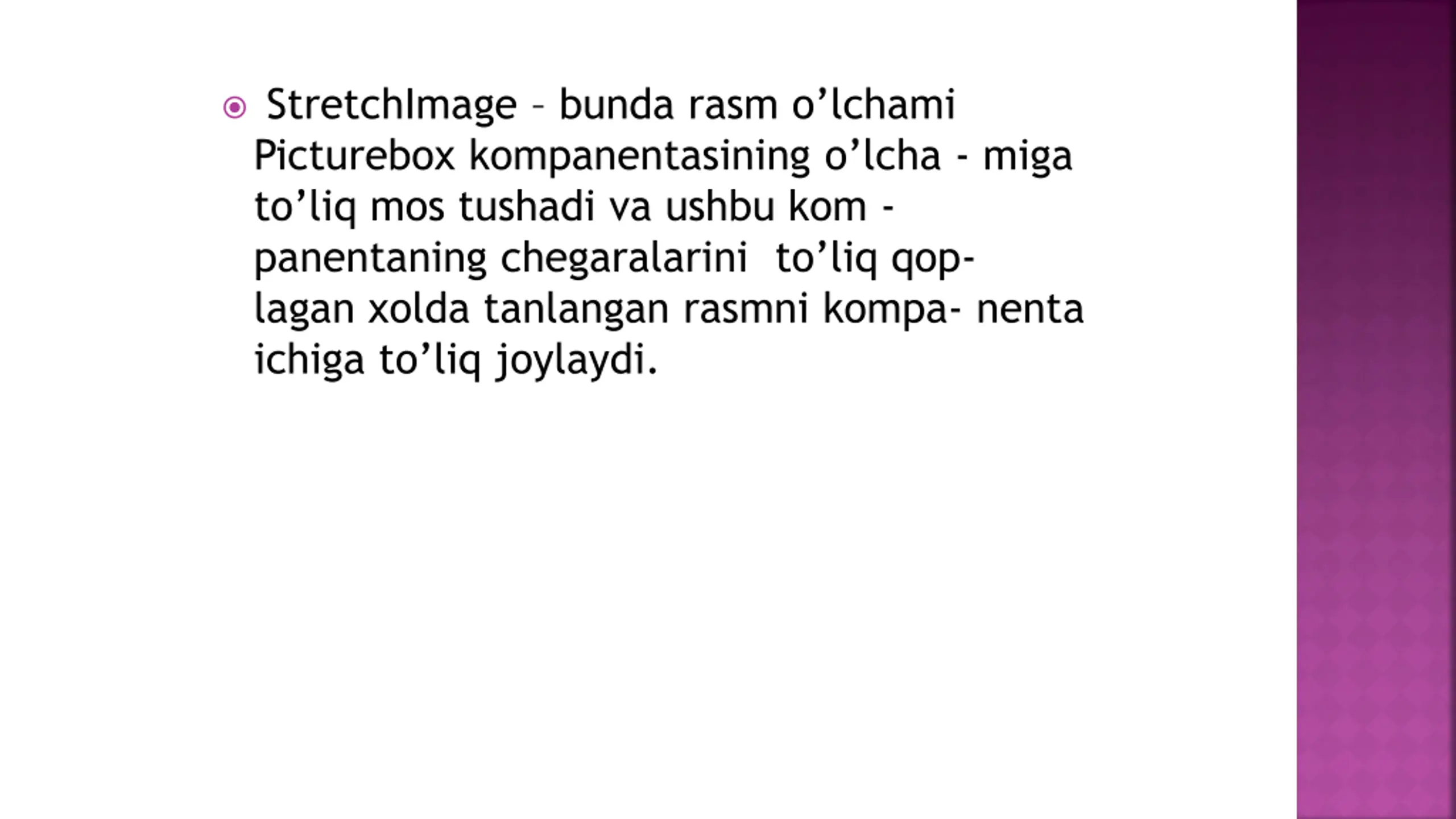 StretchImage bunda rasm olchami Picturebox kompanentasining o lcha - miga to liq mos tushadi va ushbu kom - panentaning chegaralarini to liq qop- lagan xolda tanlangan rasmni kompa- nenta ichiga to liq joylaydi.