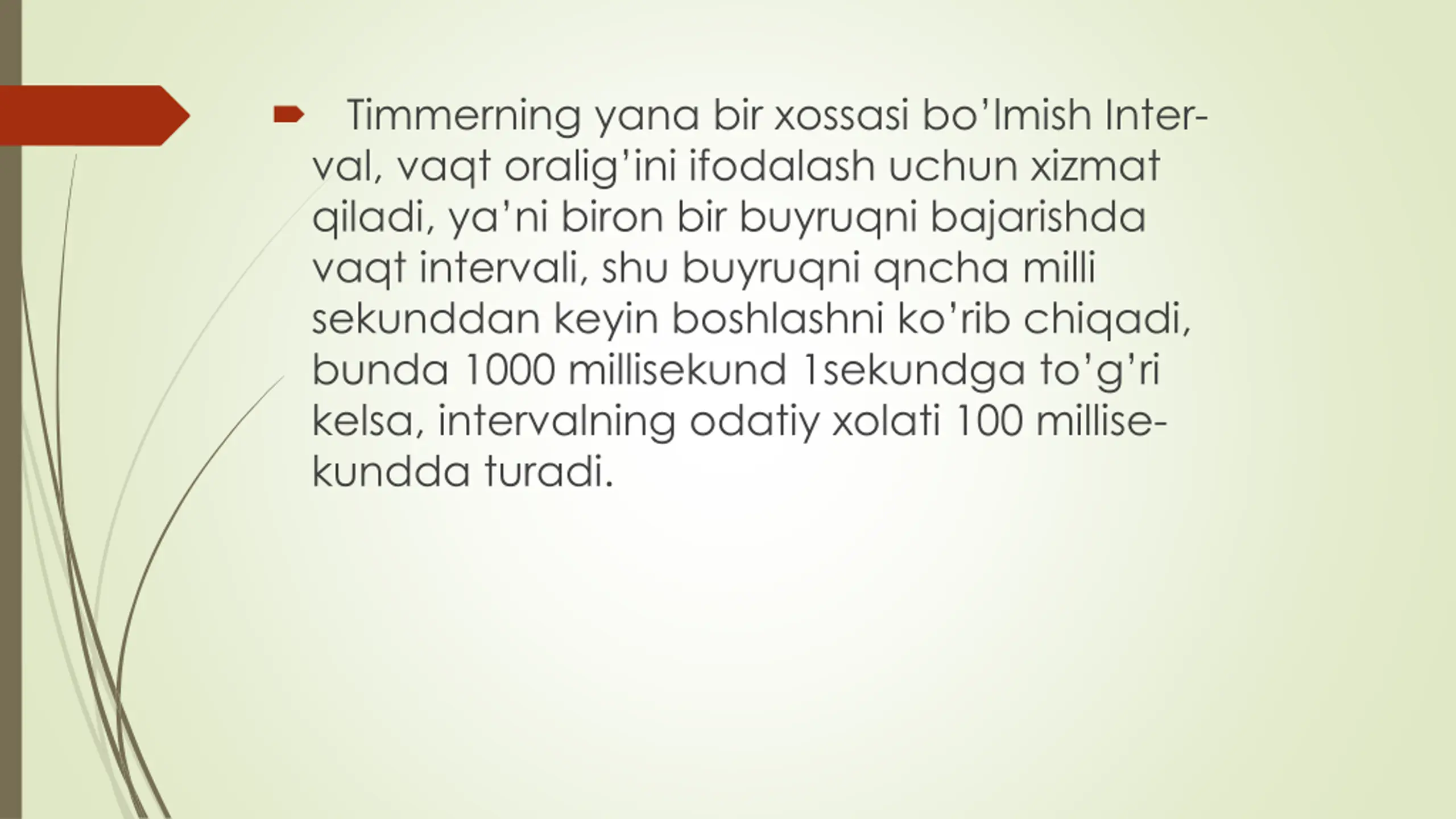 Timmerning yana bir xossasi bolmish Inter- val, vaqt oralig ini ifodalash uchun xizmat qiladi, ya ni biron bir buyruqni bajarishda vaqt intervali, shu buyruqni qncha milli sekunddan keyin boshlashni ko rib chiqadi, bunda 1000 millisekund 1sekundga to g ri kelsa, intervalning odatiy xolati 100 millise- kundda turadi.