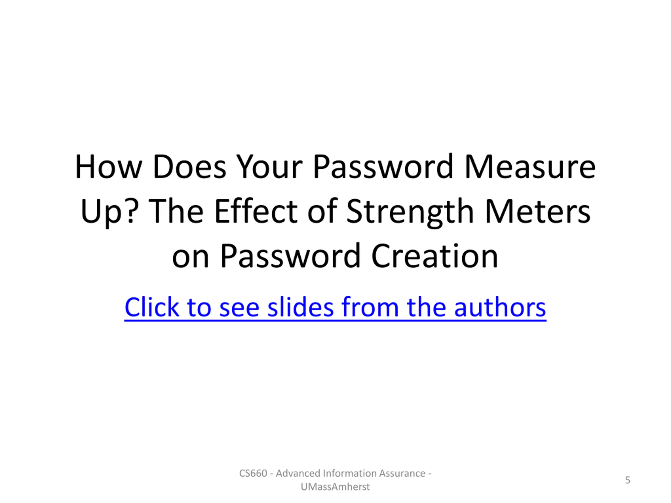 How Does Your Password Measure Up? The Effect of Strength Meters on Password Creation Click to see slides from the authors CS660 - Advanced Information Assurance - UMassAmherst 5