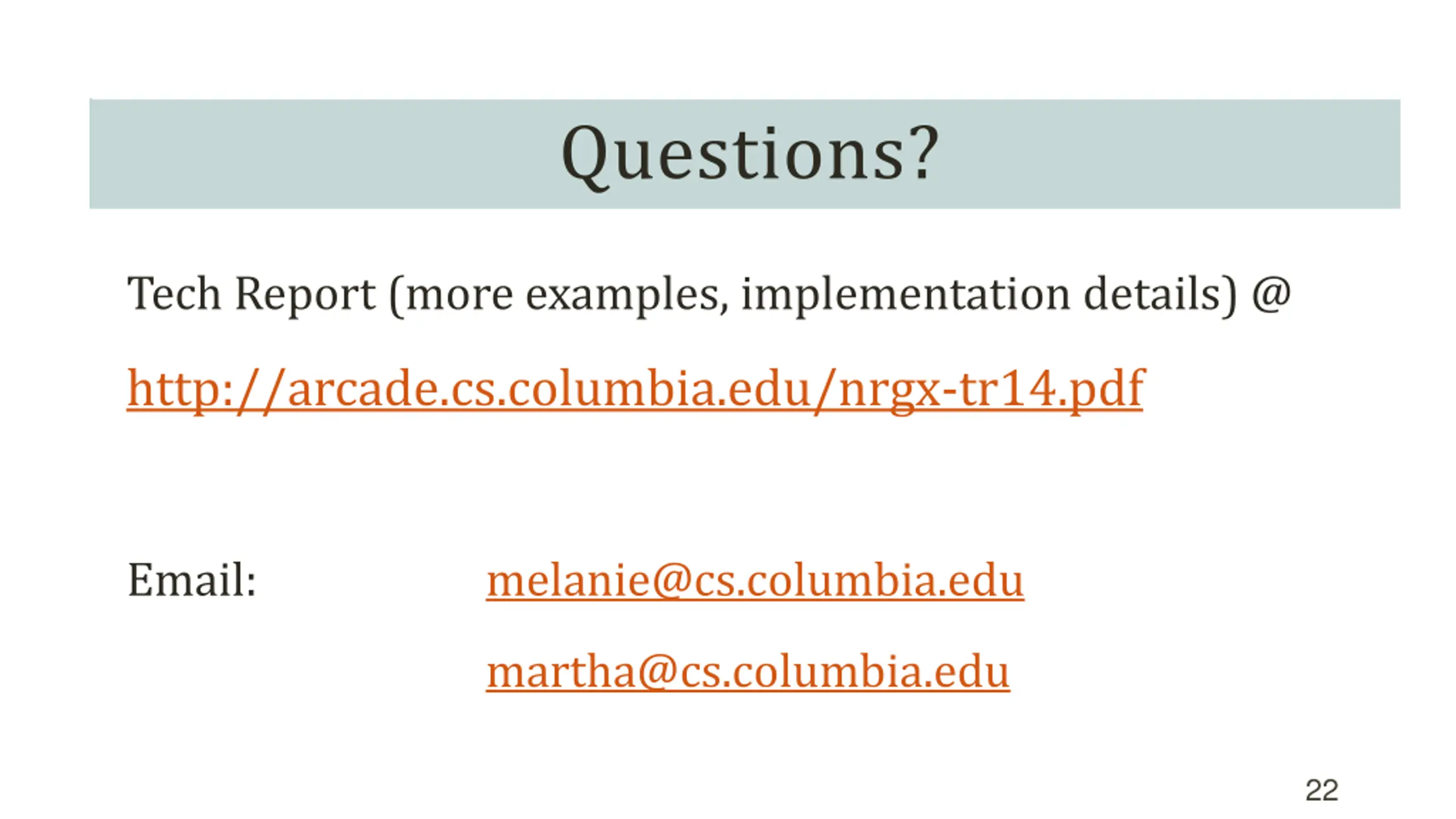Questions? Tech Report (more examples, implementation details) @ http://arcade.cs.columbia.edu/nrgx-tr14.pdf Email: melanie@cs.columbia.edu martha@cs.columbia.edu 22