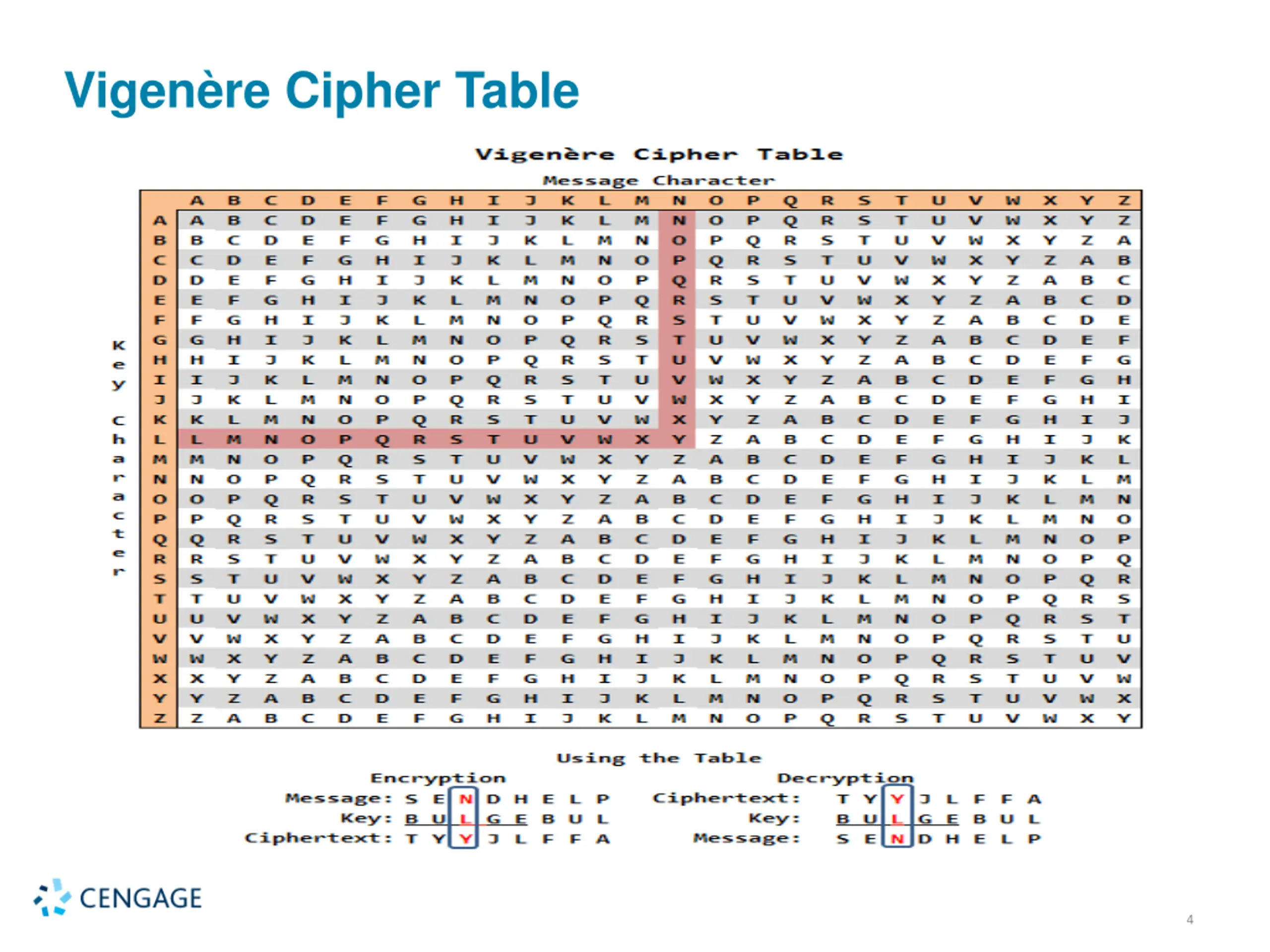 Vigenre Cipher The Vigen re Cipher is an example of a polyalphabetic cipher, sometimes called a running key cipher because the key is another text. Start with a key string: monitors to go to the bathroom and a plaintext to encrypt: four score and seven years ago. Align the two texts, possibly removing spaces: plaintext: fours corea ndsev enyea rsago key: monit orsto gotot hebat hroom ciphertext: rcizl qfkxo trlso lrzet yjoua Then use the letter pairs to look up an encryption in a table (called a Vigen re Tableau or tabula recta). What is the corresponding decryption algorithm? 3