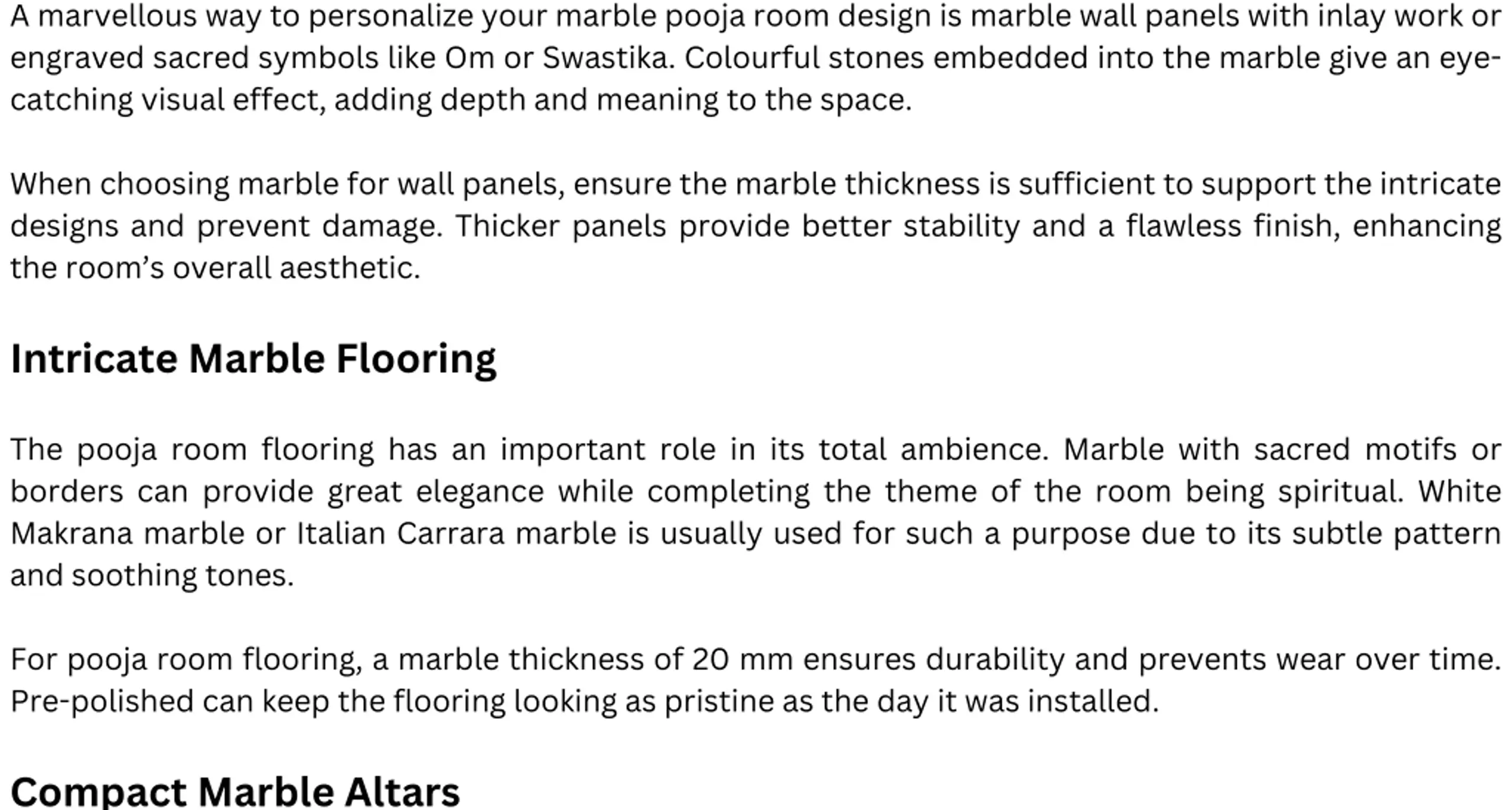 A marvellous way to personalize your marble pooja room design is marble wall panels with inlay work or engraved sacred symbols like Om or Swastika. Colourful stones embedded into the marble give an eye- catching visual effect, adding depth and meaning to the space. When choosing marble for wall panels, ensure the marble thickness is sufficient to support the intricate designs and prevent damage. Thicker panels provide better stability and a flawless finish, enhancing the room s overall aesthetic. Intricate Marble Flooring The pooja room flooring has an important role in its total ambience. Marble with sacred motifs or borders can provide great elegance while completing the theme of the room being spiritual. White Makrana marble or Italian Carrara marble is usually used for such a purpose due to its subtle pattern and soothing tones. For pooja room flooring, a marble thickness of 20 mm ensures durability and prevents wear over time. Pre-polished can keep the flooring looking as pristine as the day it was installed. Compact Marble Altars