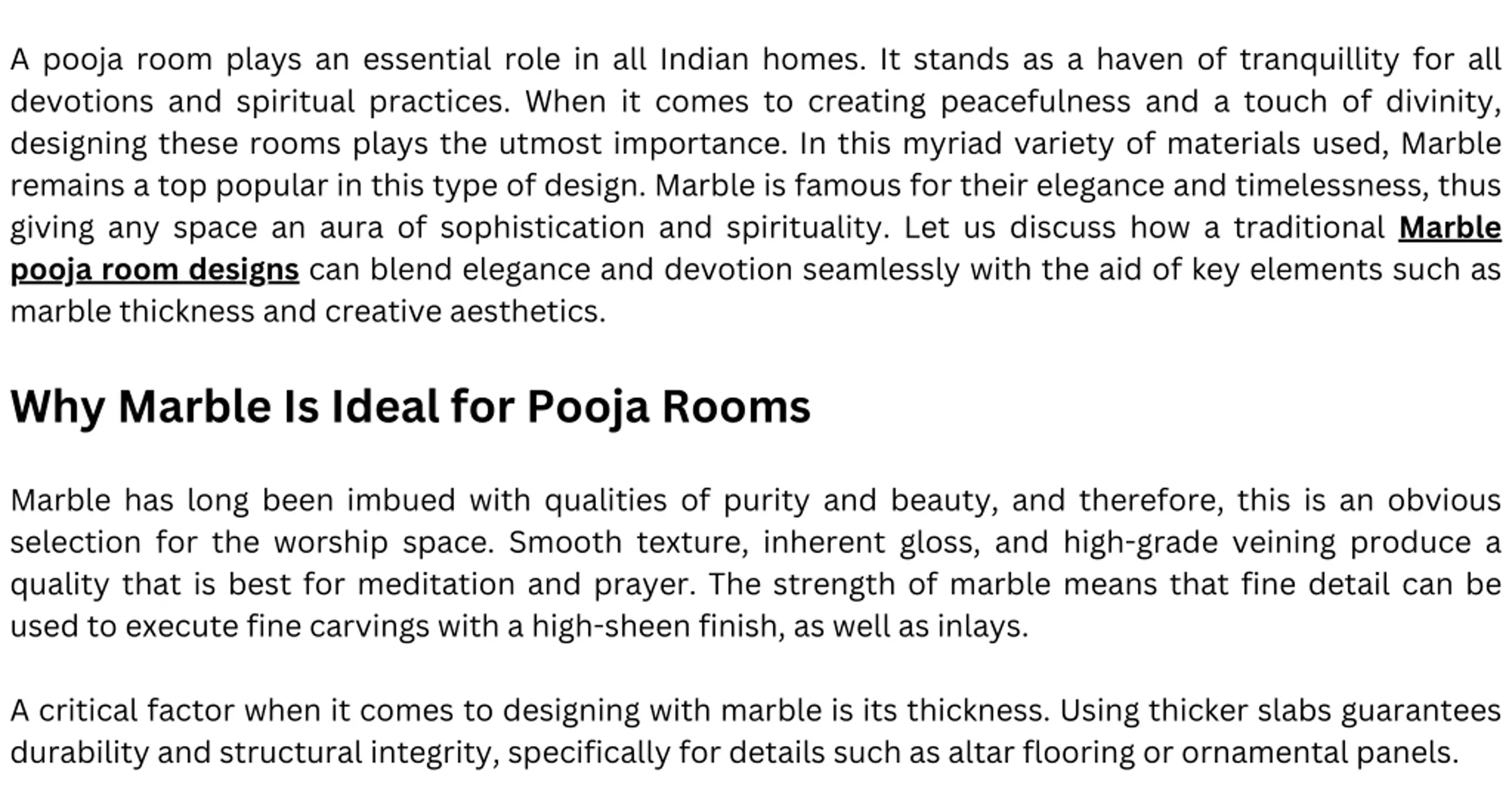 Let us discuss how a traditional Marble pooja room designs can blend elegance and devotion seamlessly with the aid of key elements such as marble thickness and creative aesthetics.