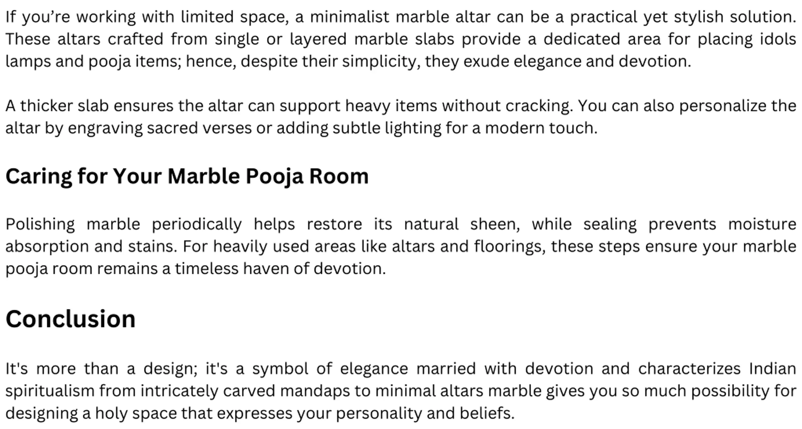 If youre working with limited space, a minimalist marble altar can be a practical yet stylish solution. These altars crafted from single or layered marble slabs provide a dedicated area for placing idols lamps and pooja items; hence, despite their simplicity, they exude elegance and devotion. A thicker slab ensures the altar can support heavy items without cracking. You can also personalize the altar by engraving sacred verses or adding subtle lighting for a modern touch. Caring for Your Marble Pooja Room Polishing marble periodically helps restore its natural sheen, while sealing prevents moisture absorption and stains. For heavily used areas like altars and floorings, these steps ensure your marble pooja room remains a timeless haven of devotion. Conclusion It's more than a design; it's a symbol of elegance married with devotion and characterizes Indian spiritualism from intricately carved mandaps to minimal altars marble gives you so much possibility for designing a holy space that expresses your personality and beliefs.
