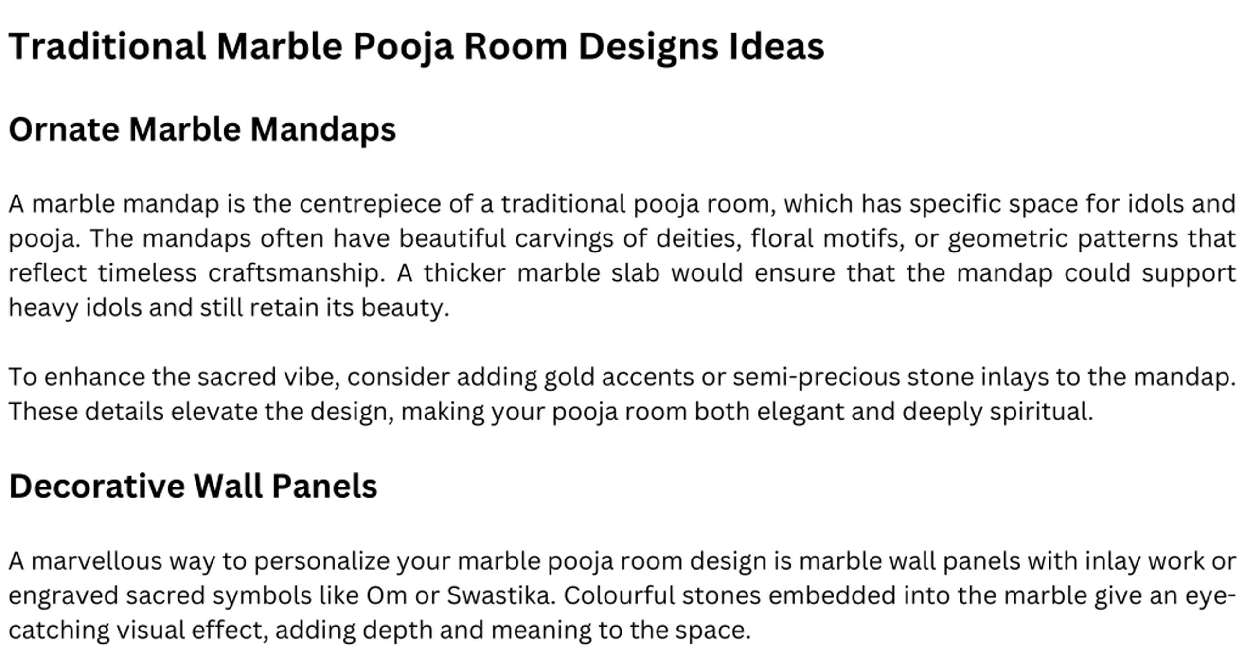 A pooja room plays an essential role in all Indian homes. It stands as a haven of tranquillity for all devotions and spiritual practices. When it comes to creating peacefulness and a touch of divinity, designing these rooms plays the utmost importance. In this myriad variety of materials used, Marble remains a top popular in this type of design. Marble is famous for their elegance and timelessness, thus giving any space an aura of sophistication and spirituality. Let us discuss how a traditional Marble pooja room designs can blend elegance and devotion seamlessly with the aid of key elements such as marble thickness and creative aesthetics. Why Marble Is Ideal for Pooja Rooms Marble has long been imbued with qualities of purity and beauty, and therefore, this is an obvious selection for the worship space. Smooth texture, inherent gloss, and high-grade veining produce a quality that is best for meditation and prayer. The strength of marble means that fine detail can be used to execute fine carvings with a high-sheen finish, as well as inlays. A critical factor when it comes to designing with marble is its thickness. Using thicker slabs guarantees durability and structural integrity, specifically for details such as altar flooring or ornamental panels.