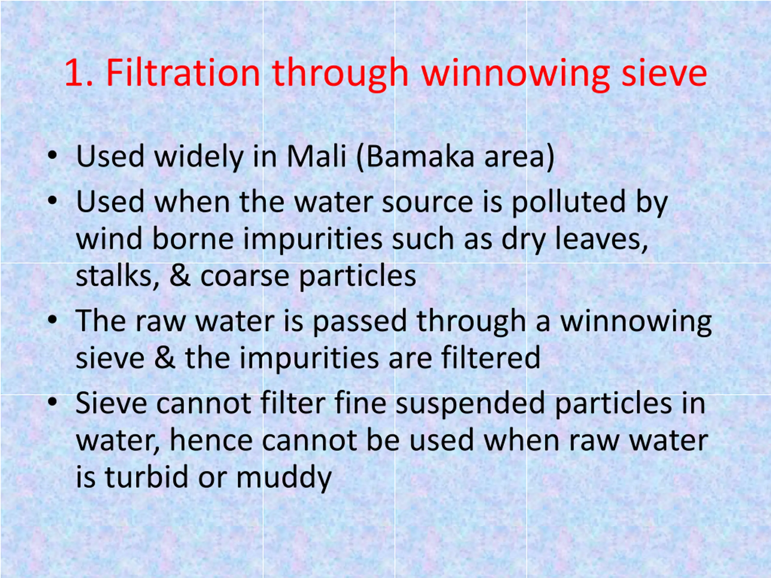 1. Filtration through winnowing sieve Used widely in Mali (Bamaka area) Used when the water source is polluted by wind borne impurities such as dry leaves, stalks, & coarse particles The raw water is passed through a winnowing sieve & the impurities are filtered Sieve cannot filter fine suspended particles in water, hence cannot be used when raw water is turbid or muddy