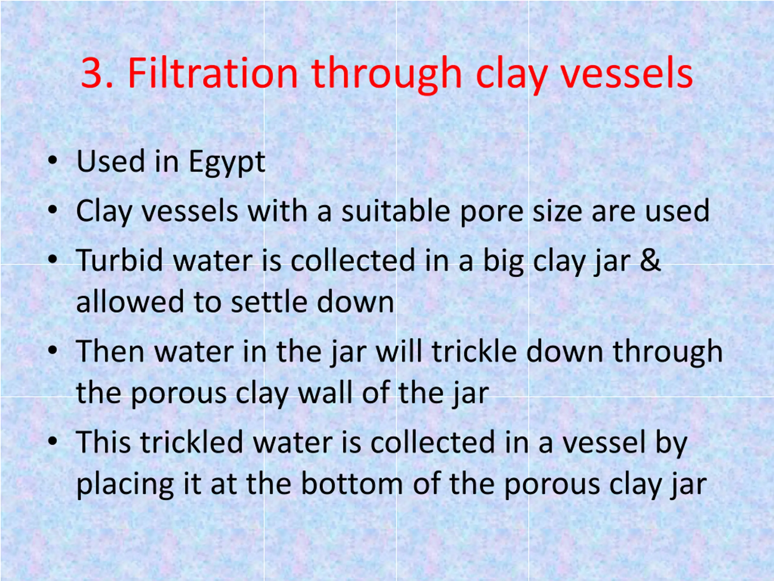 3. Filtration through clay vessels Used in Egypt Clay vessels with a suitable pore size are used Turbid water is collected in a big clay jar & allowed to settle down Then water in the jar will trickle down through the porous clay wall of the jar This trickled water is collected in a vessel by placing it at the bottom of the porous clay jar