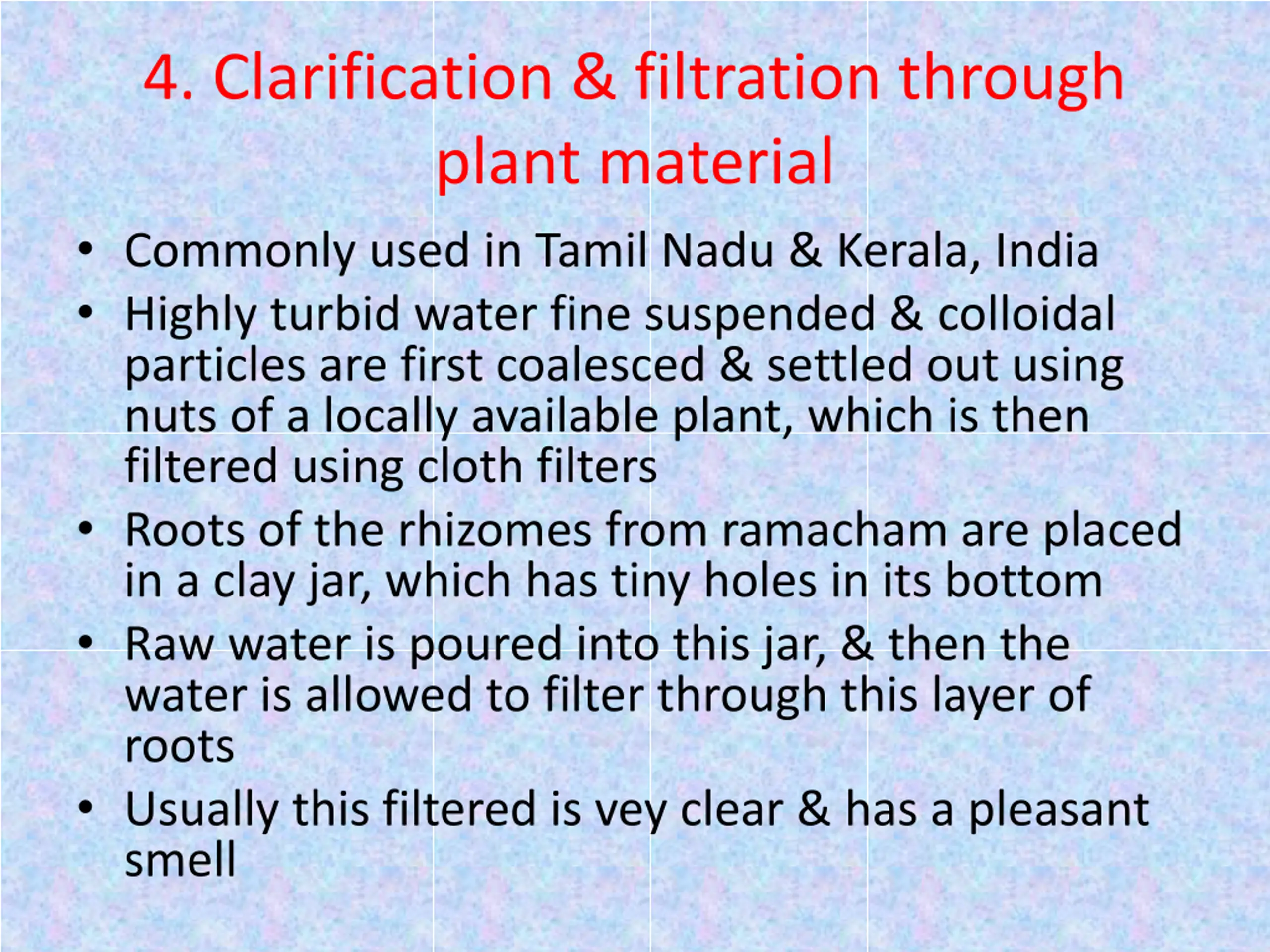 4. Clarification & filtration through plant material Commonly used in Tamil Nadu & Kerala, India Highly turbid water fine suspended & colloidal particles are first coalesced & settled out using nuts of a locally available plant, which is then filtered using cloth filters Roots of the rhizomes from ramacham are placed in a clay jar, which has tiny holes in its bottom Raw water is poured into this jar, & then the water is allowed to filter through this layer of roots Usually this filtered is vey clear & has a pleasant smell