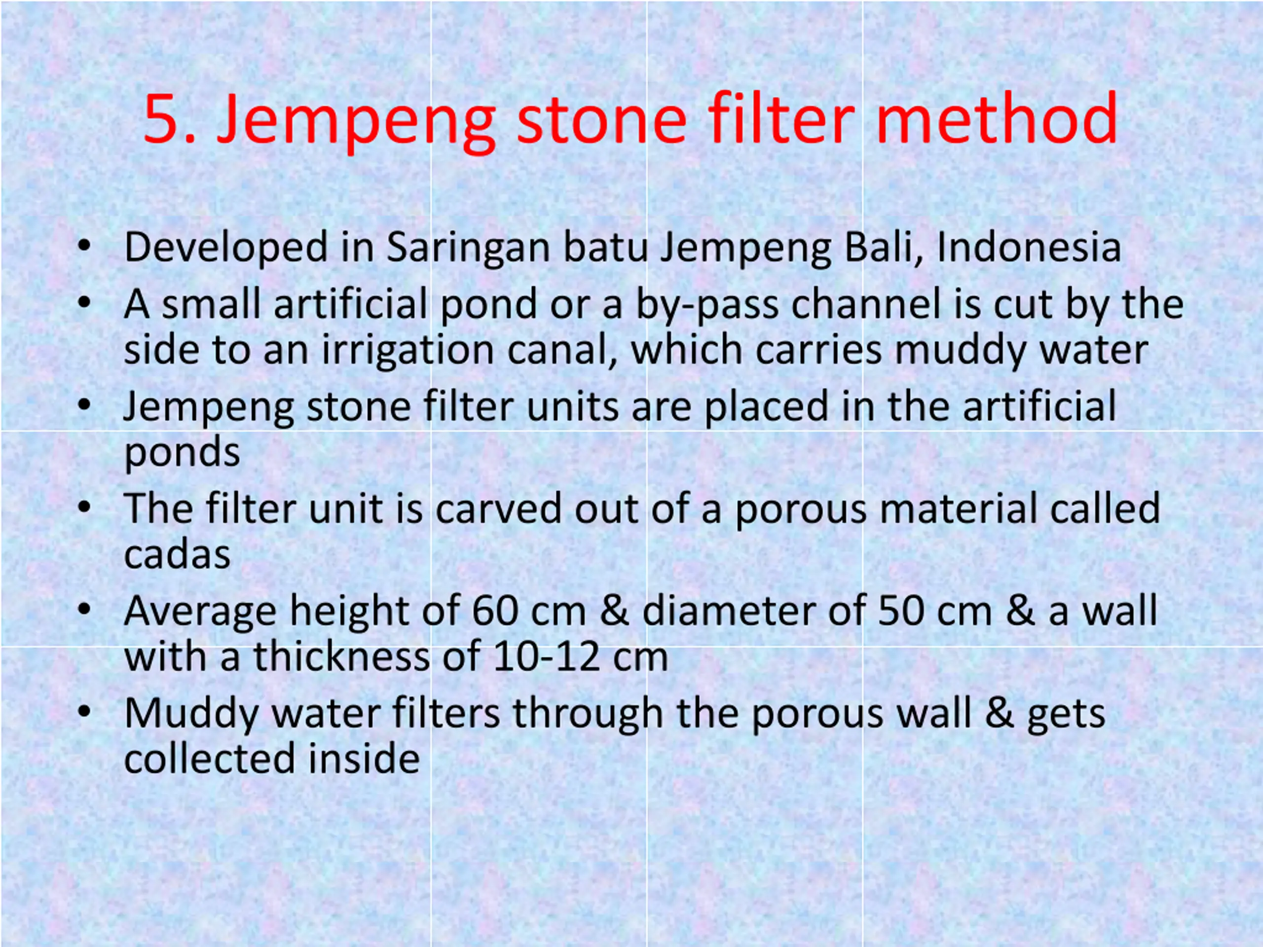 5. Jempeng stone filter method Developed in Saringan batu Jempeng Bali, Indonesia A small artificial pond or a by-pass channel is cut by the side to an irrigation canal, which carries muddy water Jempeng stone filter units are placed in the artificial ponds The filter unit is carved out of a porous material called cadas Average height of 60 cm & diameter of 50 cm & a wall with a thickness of 10-12 cm Muddy water filters through the porous wall & gets collected inside