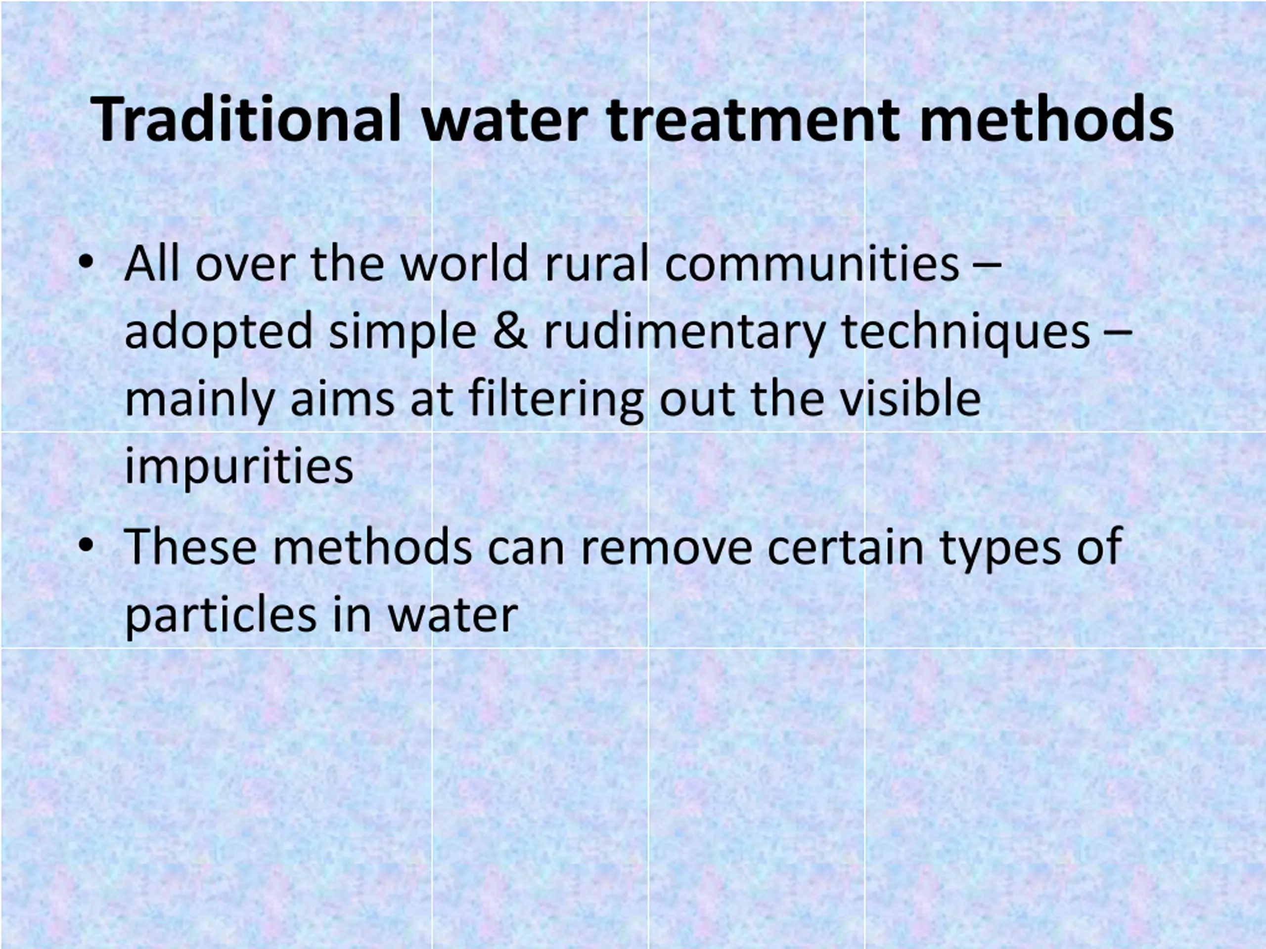 Traditional water treatment methods All over the world rural communities adopted simple & rudimentary techniques mainly aims at filtering out the visible impurities These methods can remove certain types of particles in water
