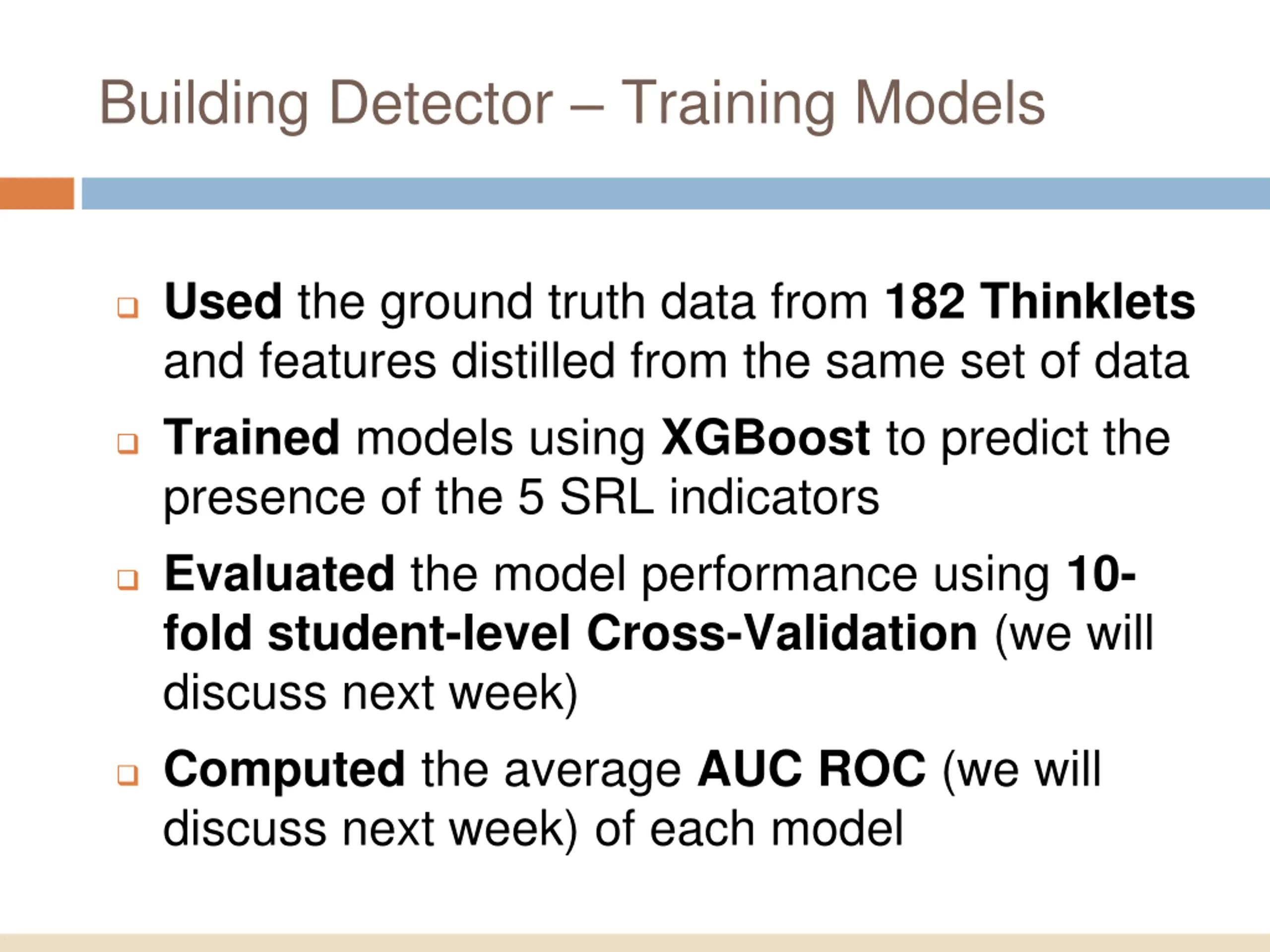 Building Detector Training Models Used the ground truth data from 182 Thinklets and features distilled from the same set of data Trained models using XGBoost to predict the presence of the 5 SRL indicators Evaluated the model performance using 10- fold student-level Cross-Validation (we will discuss next week) Computed the average AUC ROC (we will discuss next week) of each model