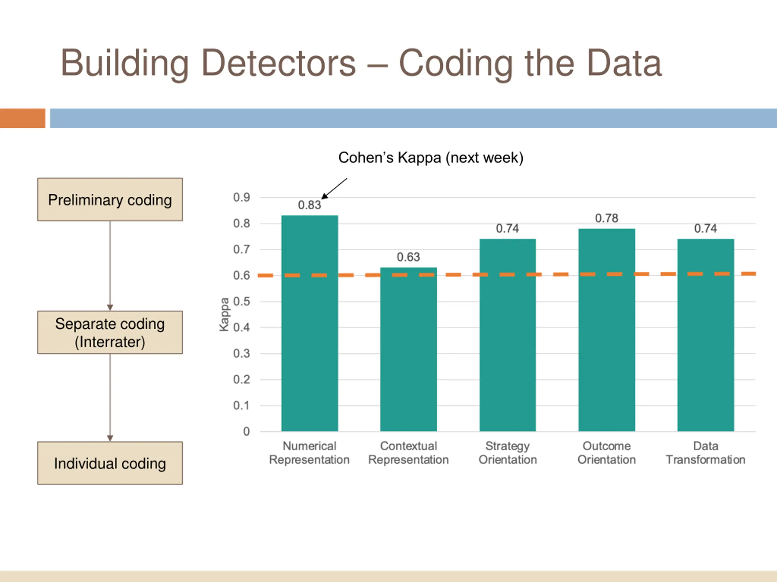 Building Detectors Coding the Data Cohen s Kappa (next week) Preliminary coding Separate coding (Interrater) Individual coding