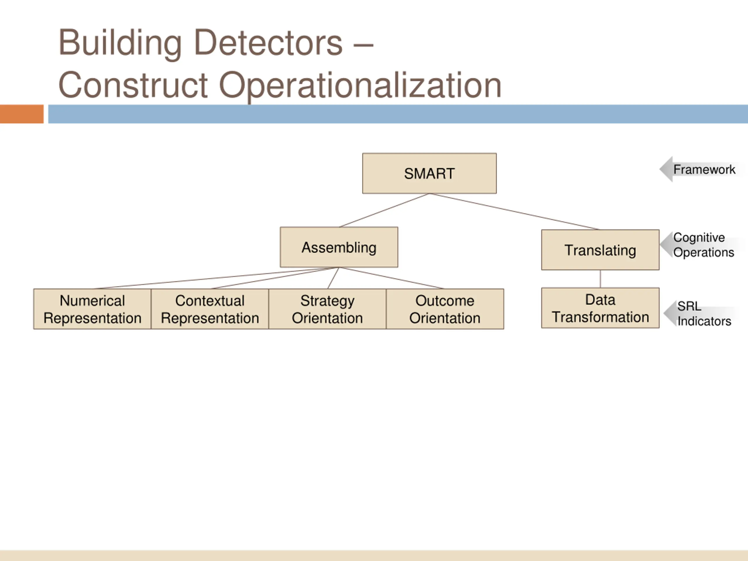 Building Detectors Construct Operationalization Framework SMART Cognitive Operations Assembling Translating Data Numerical Representation Contextual Representation Strategy Orientation Outcome Orientation SRL Indicators Transformation