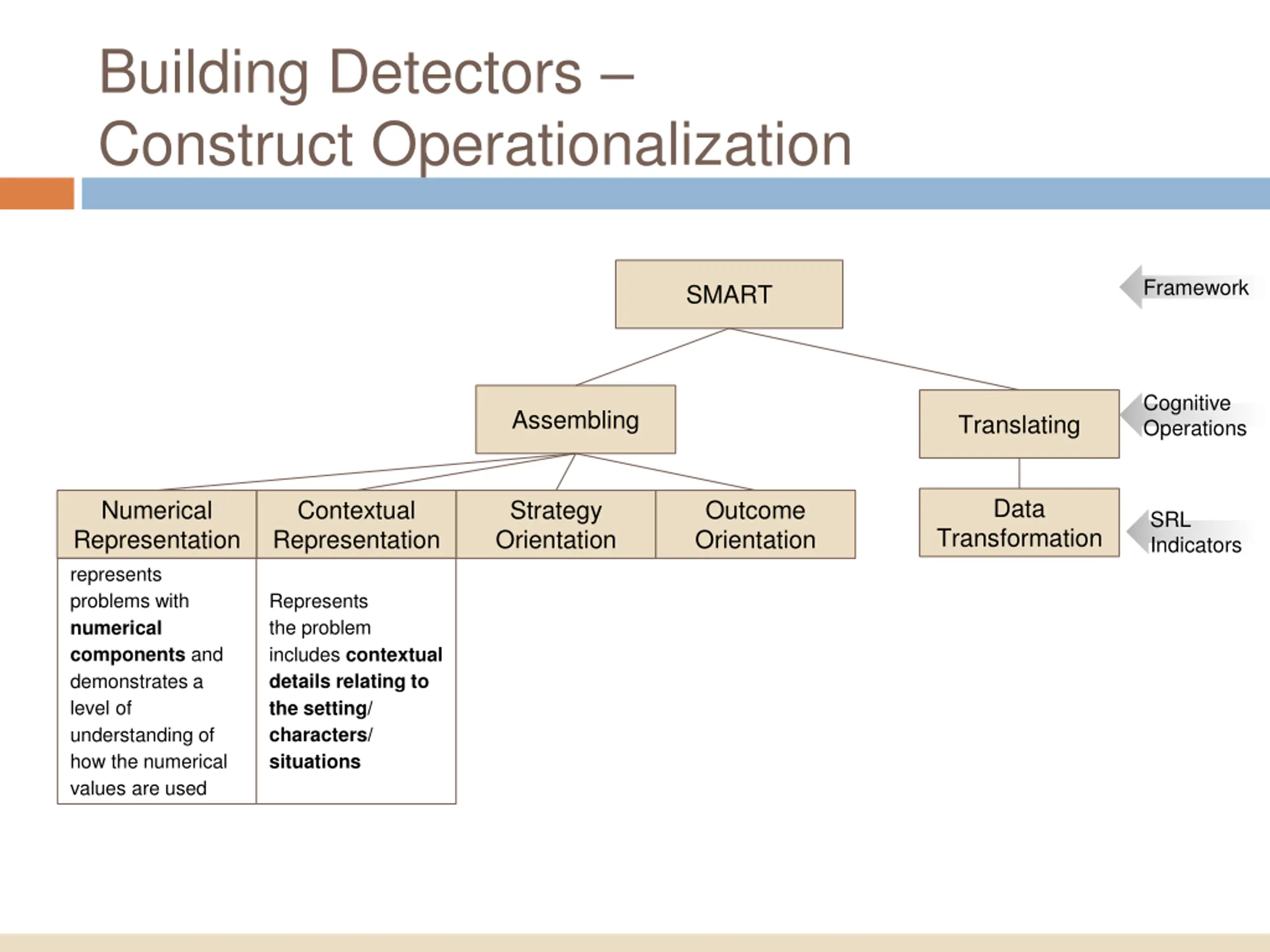 Building Detectors Construct Operationalization Framework SMART Cognitive Operations Assembling Translating Data Numerical Representation represents problems with numerical components and demonstrates a level of understanding of how the numerical values are used Contextual Representation Strategy Orientation Outcome Orientation SRL Indicators Transformation Represents the problem includes contextual details relating to the setting/ characters/ situations