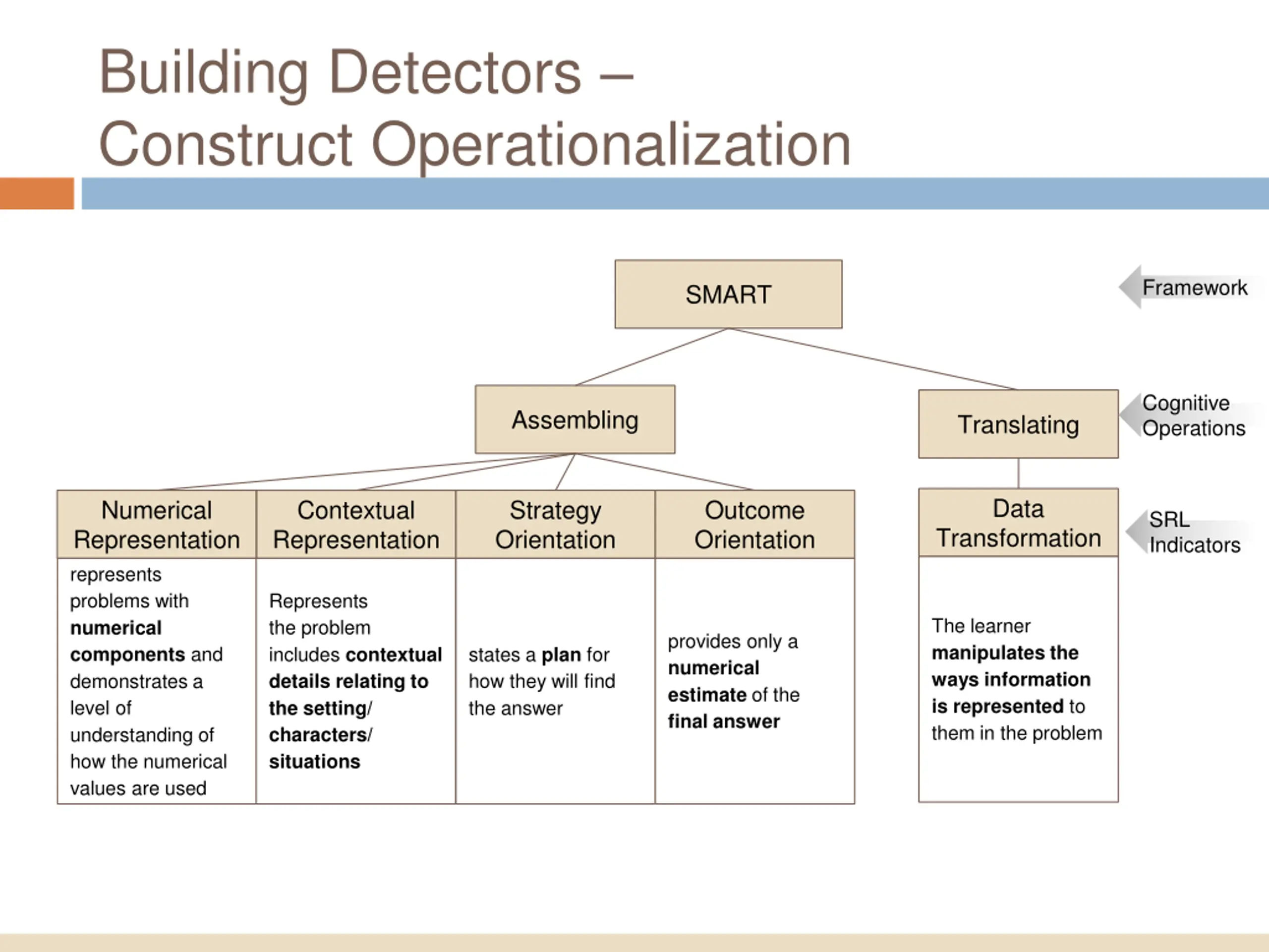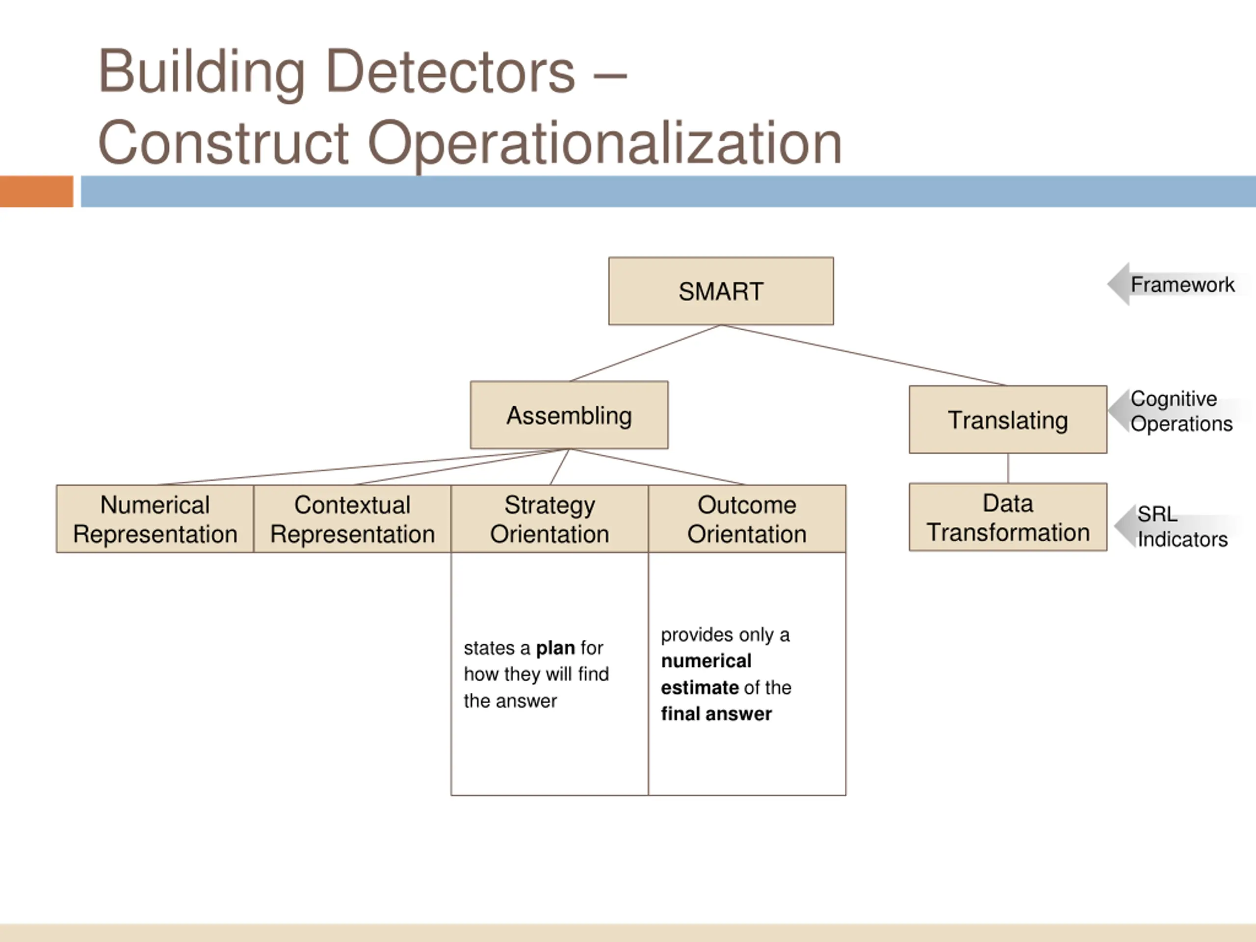 Building Detectors Construct Operationalization Framework SMART Cognitive Operations Assembling Translating Data Numerical Representation Contextual Representation Strategy Orientation Outcome Orientation SRL Indicators Transformation provides only a numerical estimate of the final answer states a plan for how they will find the answer