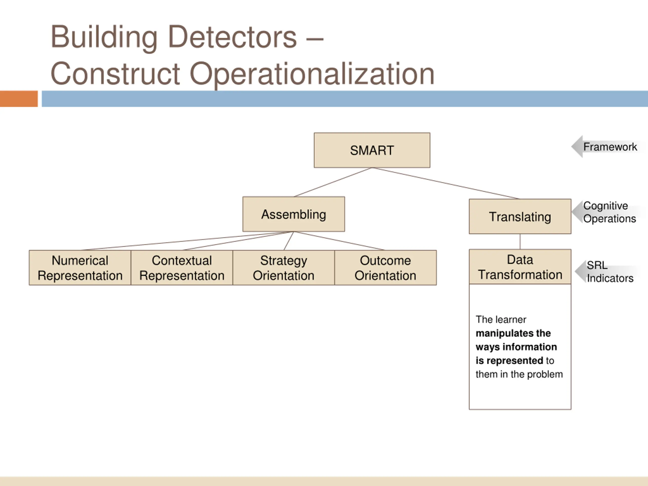 Building Detectors Construct Operationalization Framework SMART Cognitive Operations Assembling Translating Data Numerical Representation Contextual Representation Strategy Orientation Outcome Orientation SRL Indicators Transformation The learner manipulates the ways information is represented to them in the problem