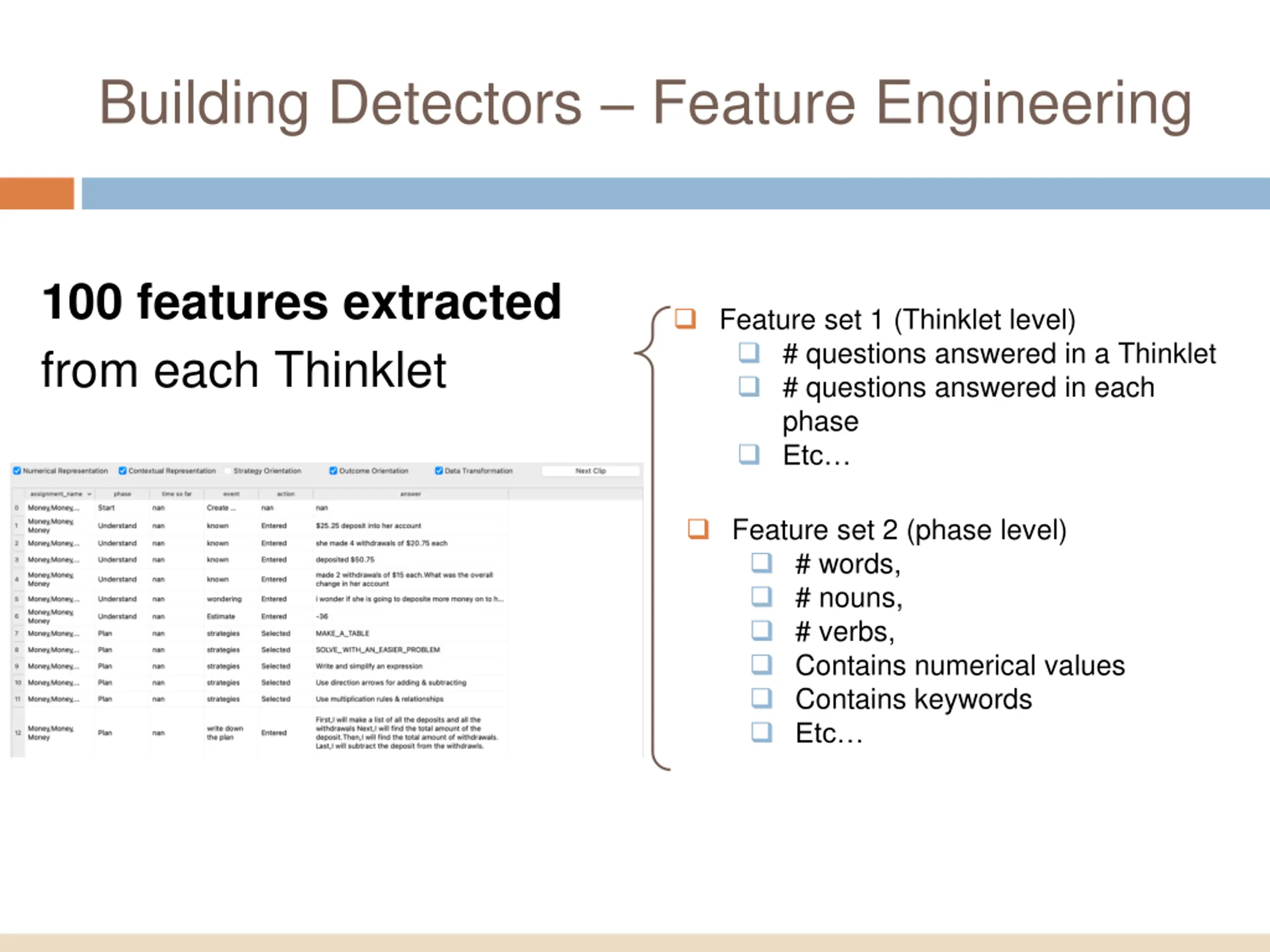 Building Detectors Feature Engineering 100 features extracted from each Thinklet Feature set 1 (Thinklet level) # questions answered in a Thinklet # questions answered in each phase Etc Feature set 2 (phase level) # words, # nouns, # verbs, Contains numerical values Contains keywords Etc