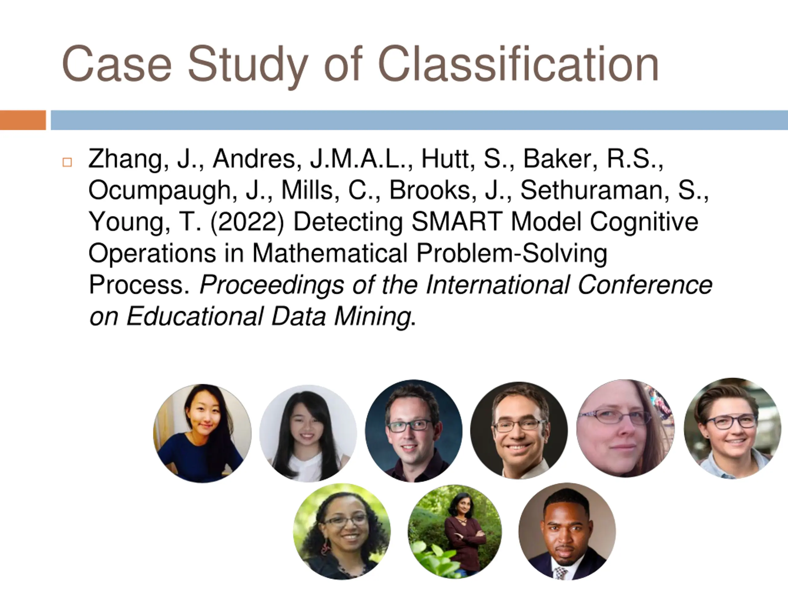 Case Study of Classification Zhang, J., Andres, J.M.A.L., Hutt, S., Baker, R.S., Ocumpaugh, J., Mills, C., Brooks, J., Sethuraman, S., Young, T. (2022) Detecting SMART Model Cognitive Operations in Mathematical Problem-Solving Process. Proceedings of the International Conference on Educational Data Mining.