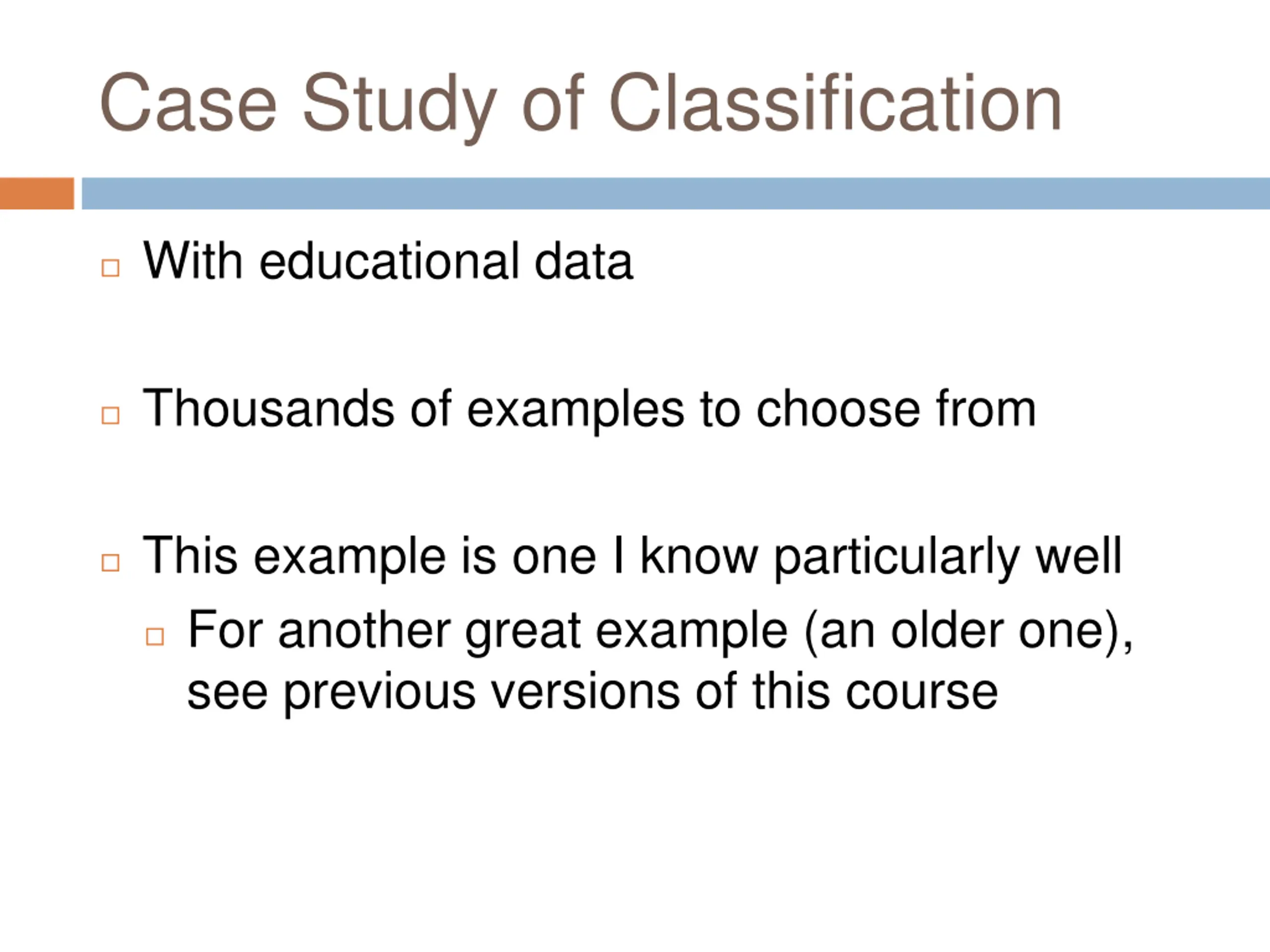 Case Study of Classification With educational data Thousands of examples to choose from This example is one I know particularly well For another great example (an older one), see previous versions of this course