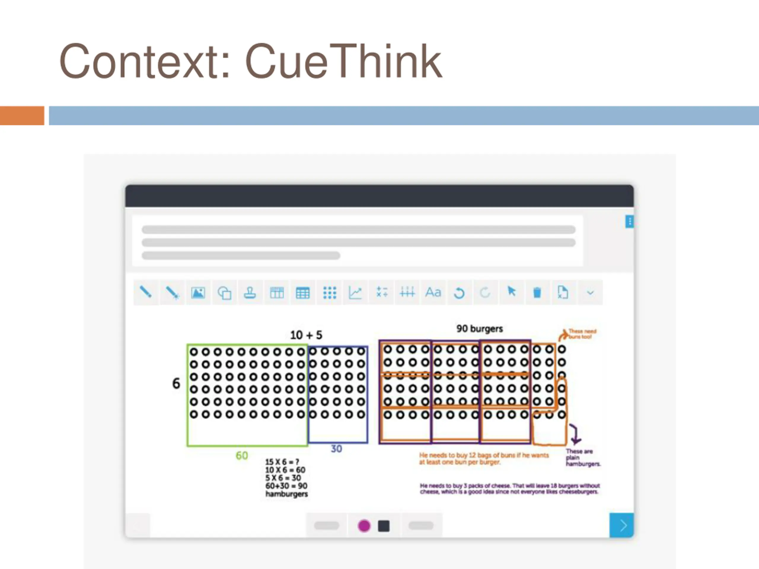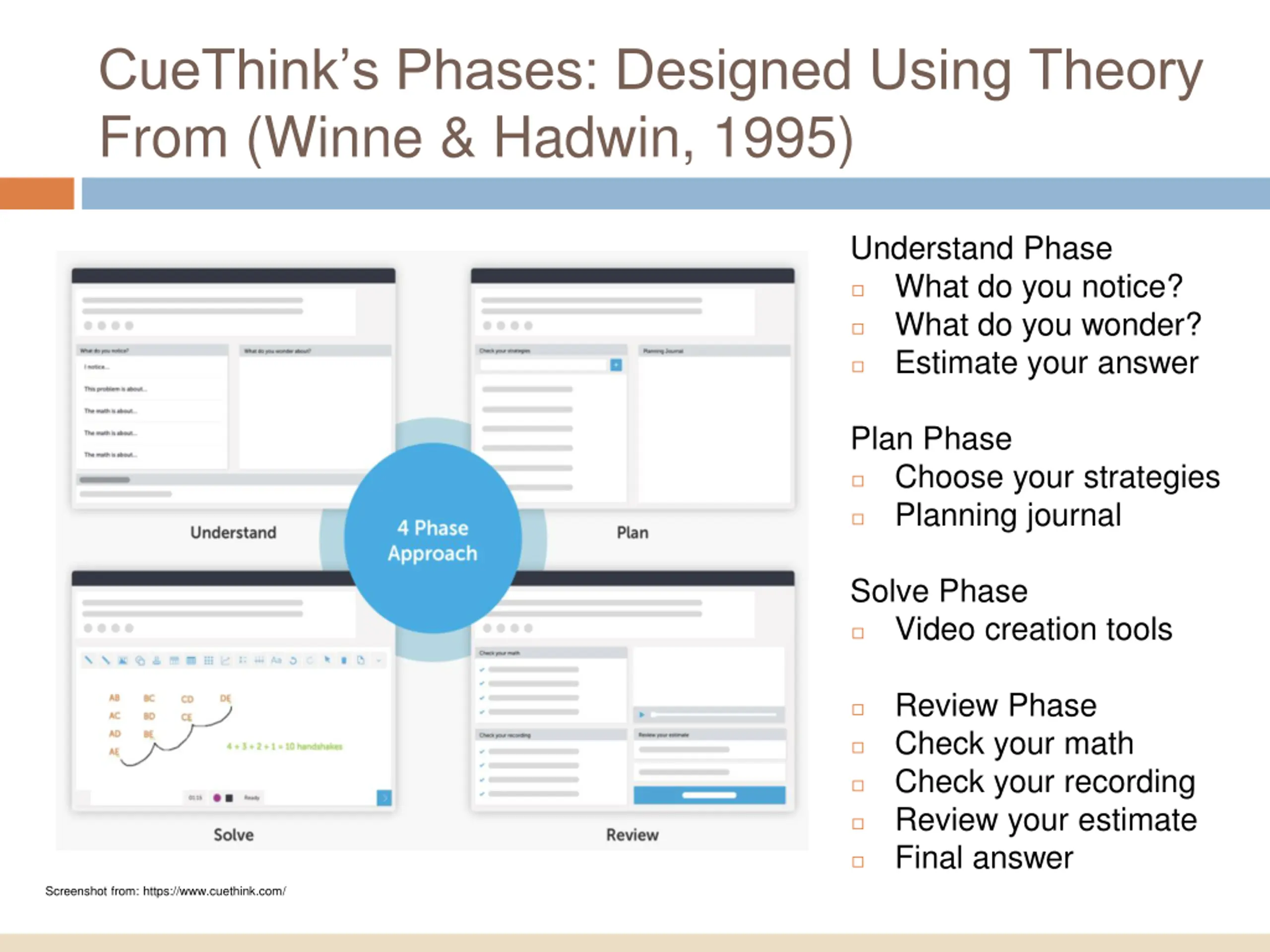 CueThinks Phases: Designed Using Theory From (Winne & Hadwin, 1995) Understand Phase What do you notice? What do you wonder? Estimate your answer Plan Phase Choose your strategies Planning journal Solve Phase Video creation tools Review Phase Check your math Check your recording Review your estimate Final answer Screenshot from: https://www.cuethink.com/