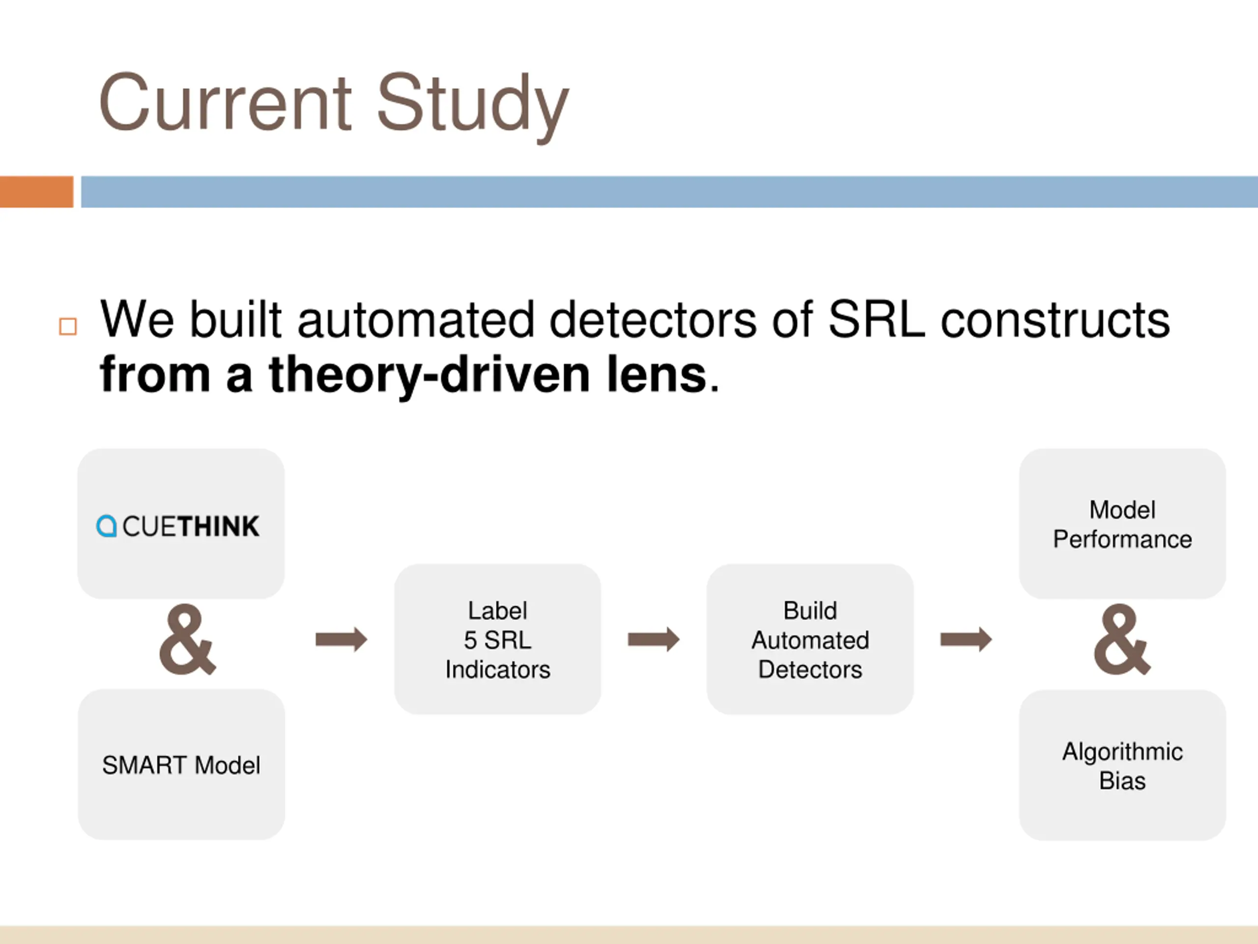 Current Study We built automated detectors of SRL constructs from a theory-driven lens. Model Performance Label 5 SRL Indicators Build & & Automated Detectors Algorithmic Bias SMART Model