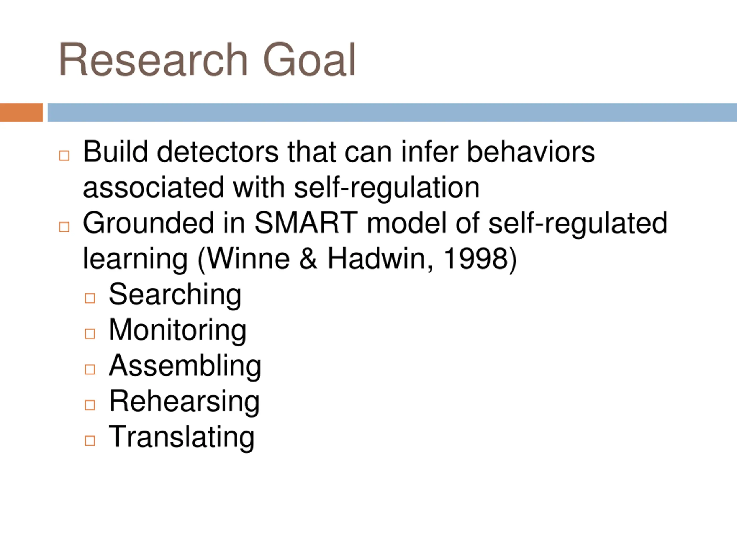 Research Goal Build detectors that can infer behaviors associated with self-regulation Grounded in SMART model of self-regulated learning (Winne & Hadwin, 1998) Searching Monitoring Assembling Rehearsing Translating