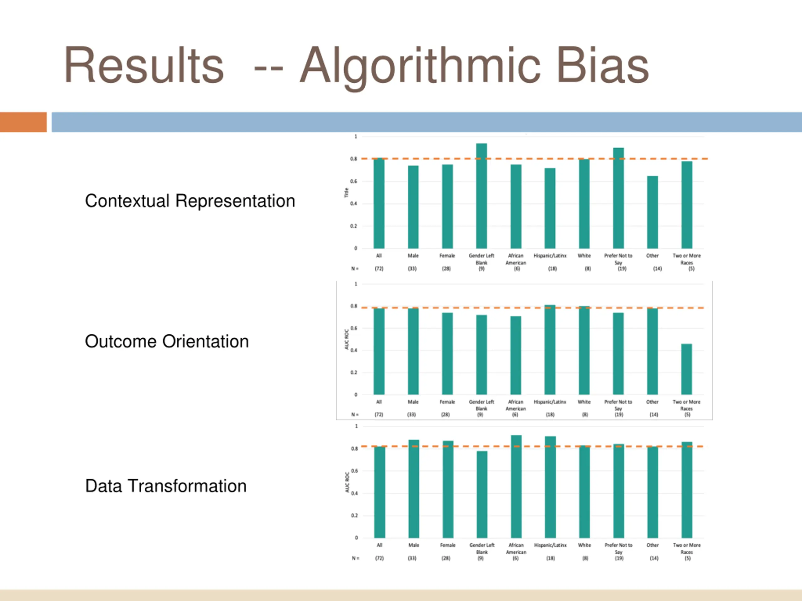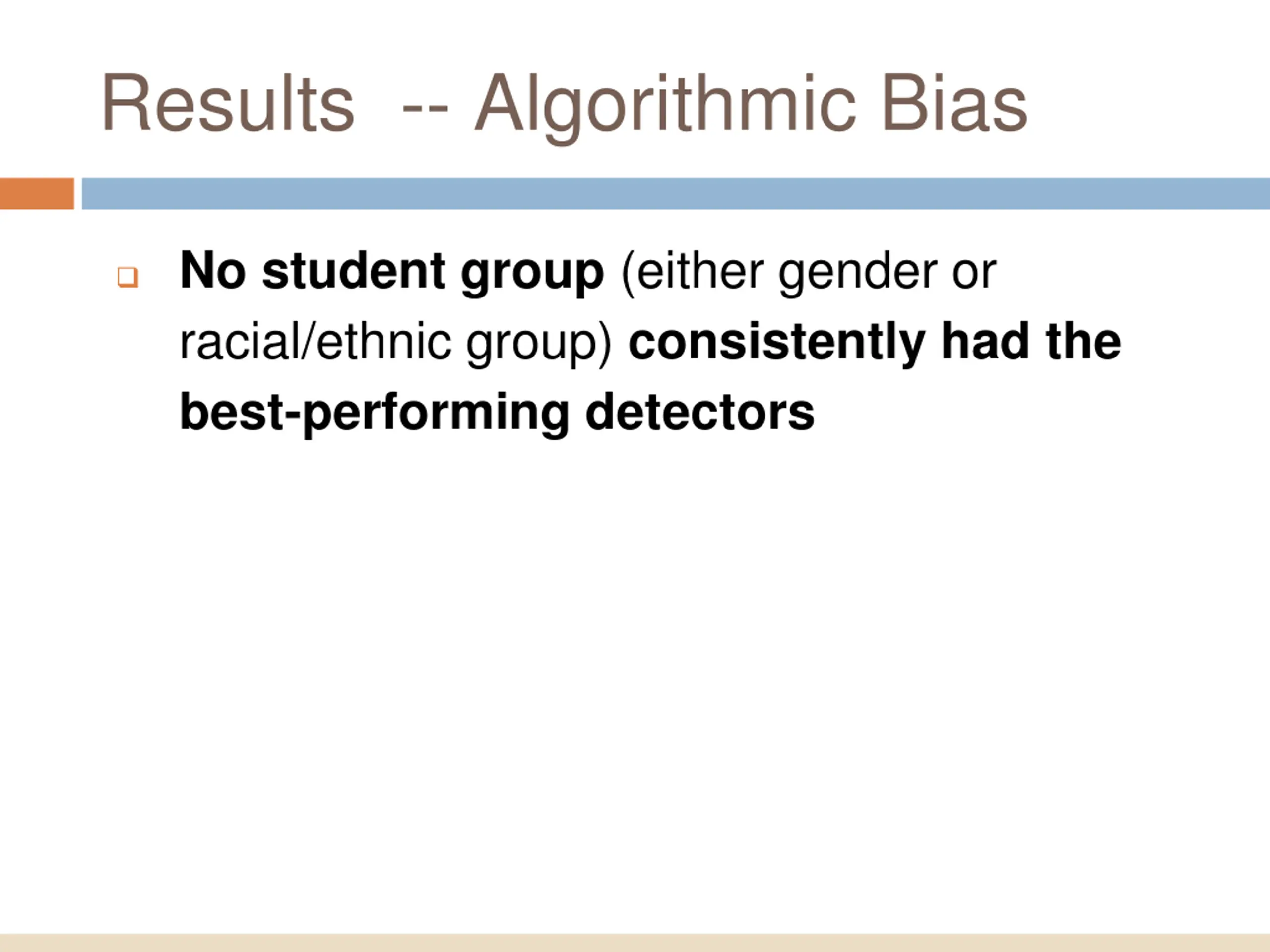 Results -- Algorithmic Bias No student group (either gender or racial/ethnic group) consistently had the best-performing detectors
