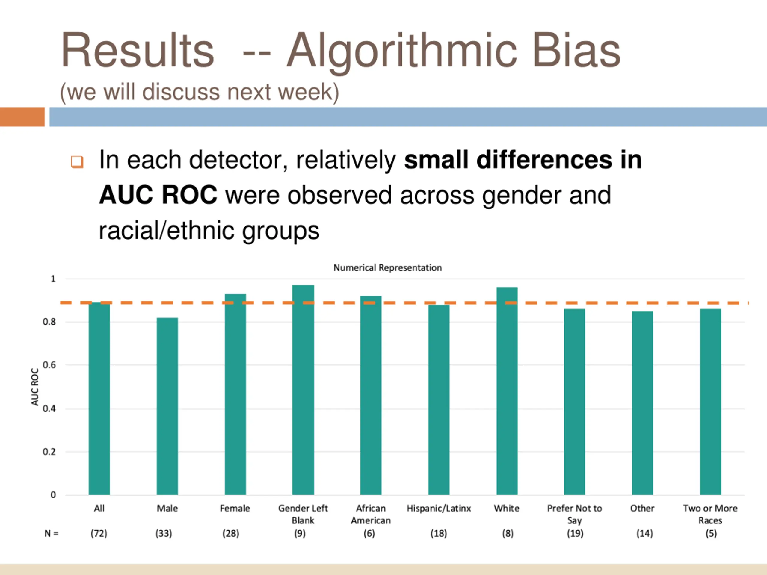 Results -- Algorithmic Bias (we will discuss next week) In each detector, relatively small differences in AUC ROC were observed across gender and racial/ethnic groups