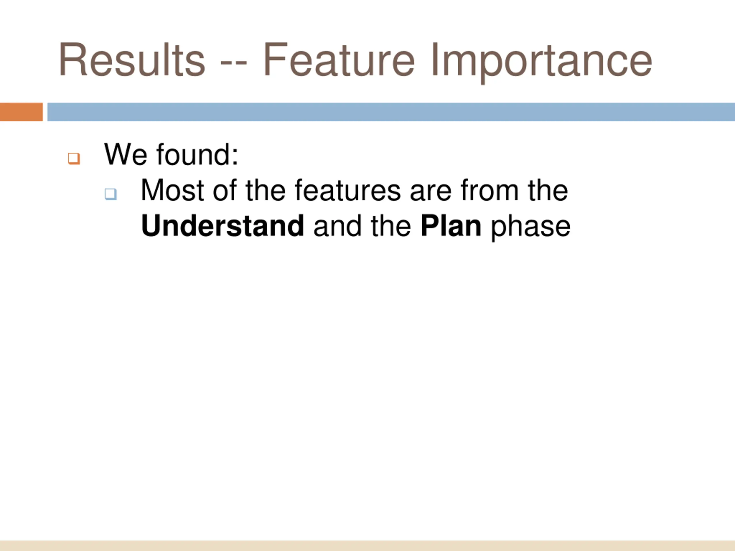 Results -- Feature Importance We found: Most of the features are from the Understand and the Plan phase