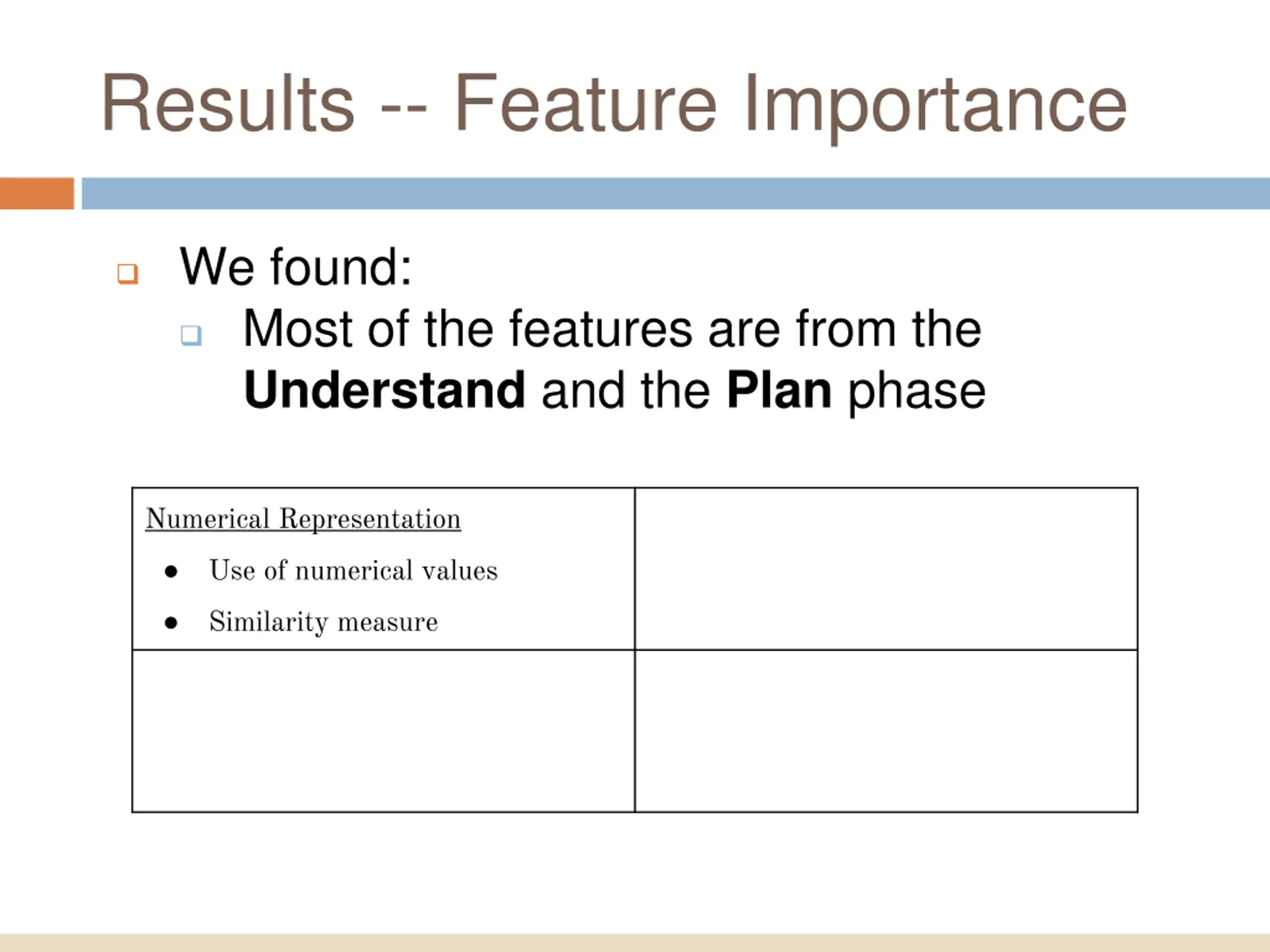 Results -- Feature Importance We found: Most of the features are from the Understand and the Plan phase Numerical Representation Use of numerical values Similarity measure