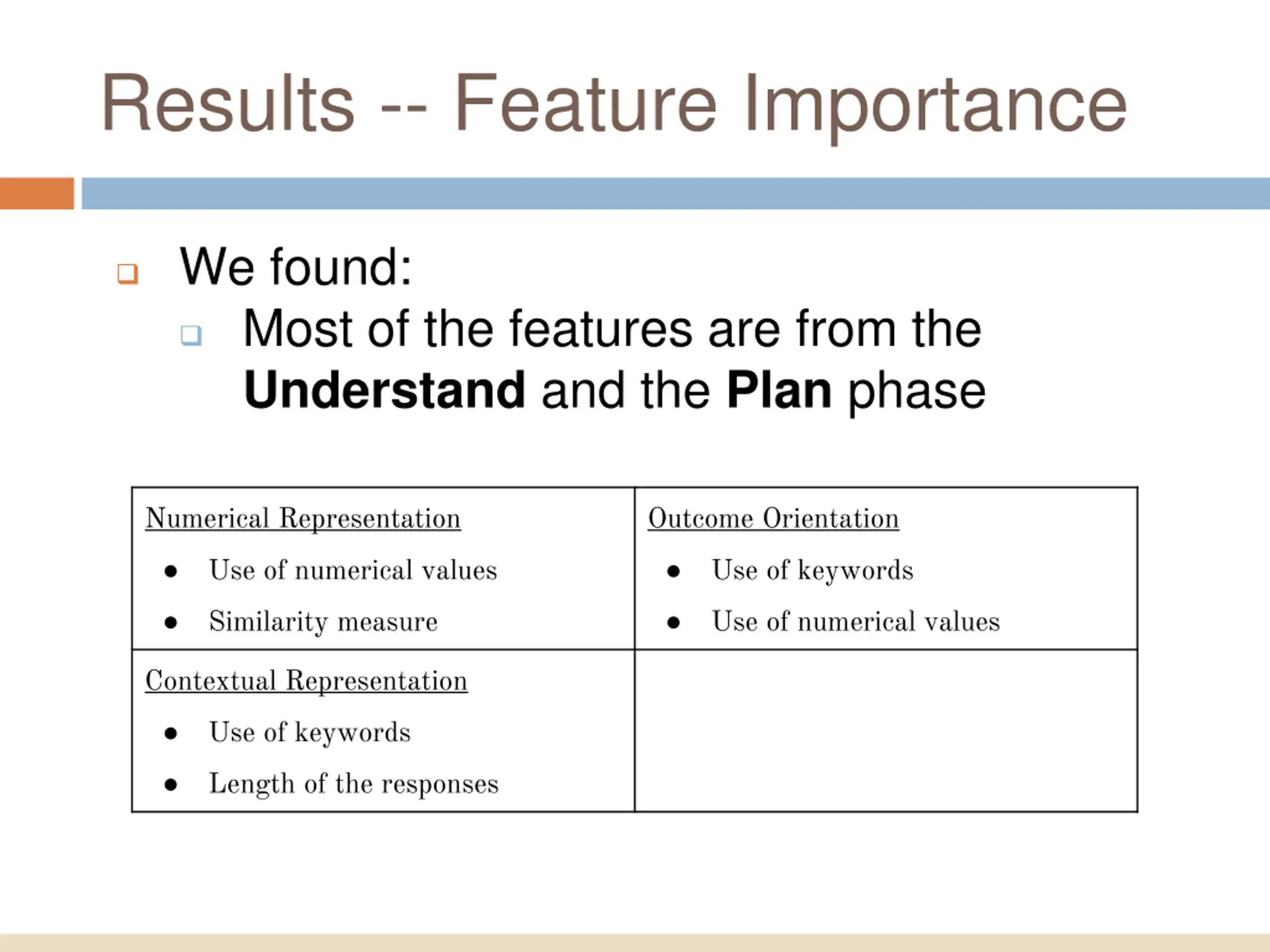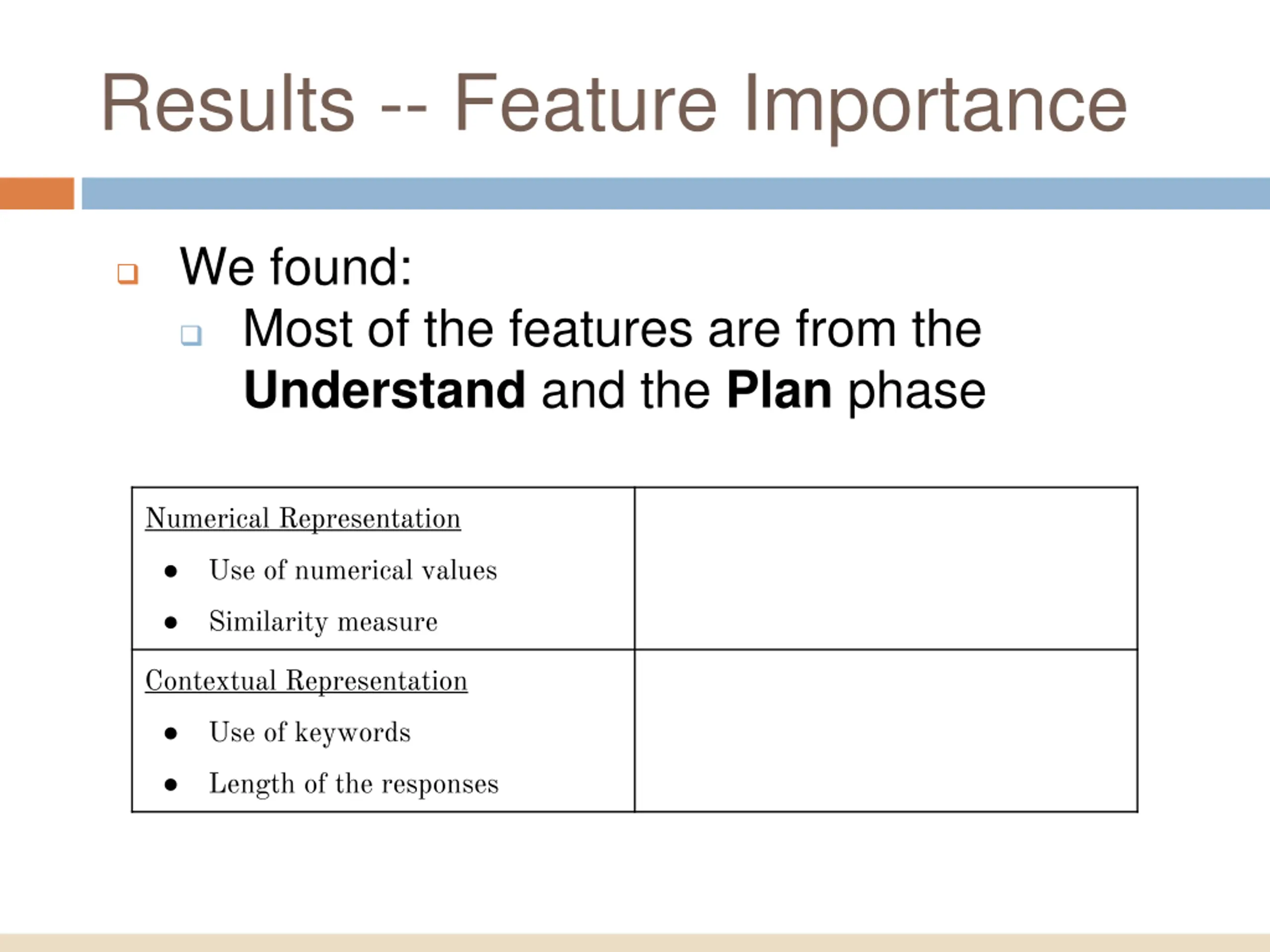 Results -- Feature Importance We found: Most of the features are from the Understand and the Plan phase Numerical Representation Use of numerical values Similarity measure Contextual Representation Use of keywords Length of the responses