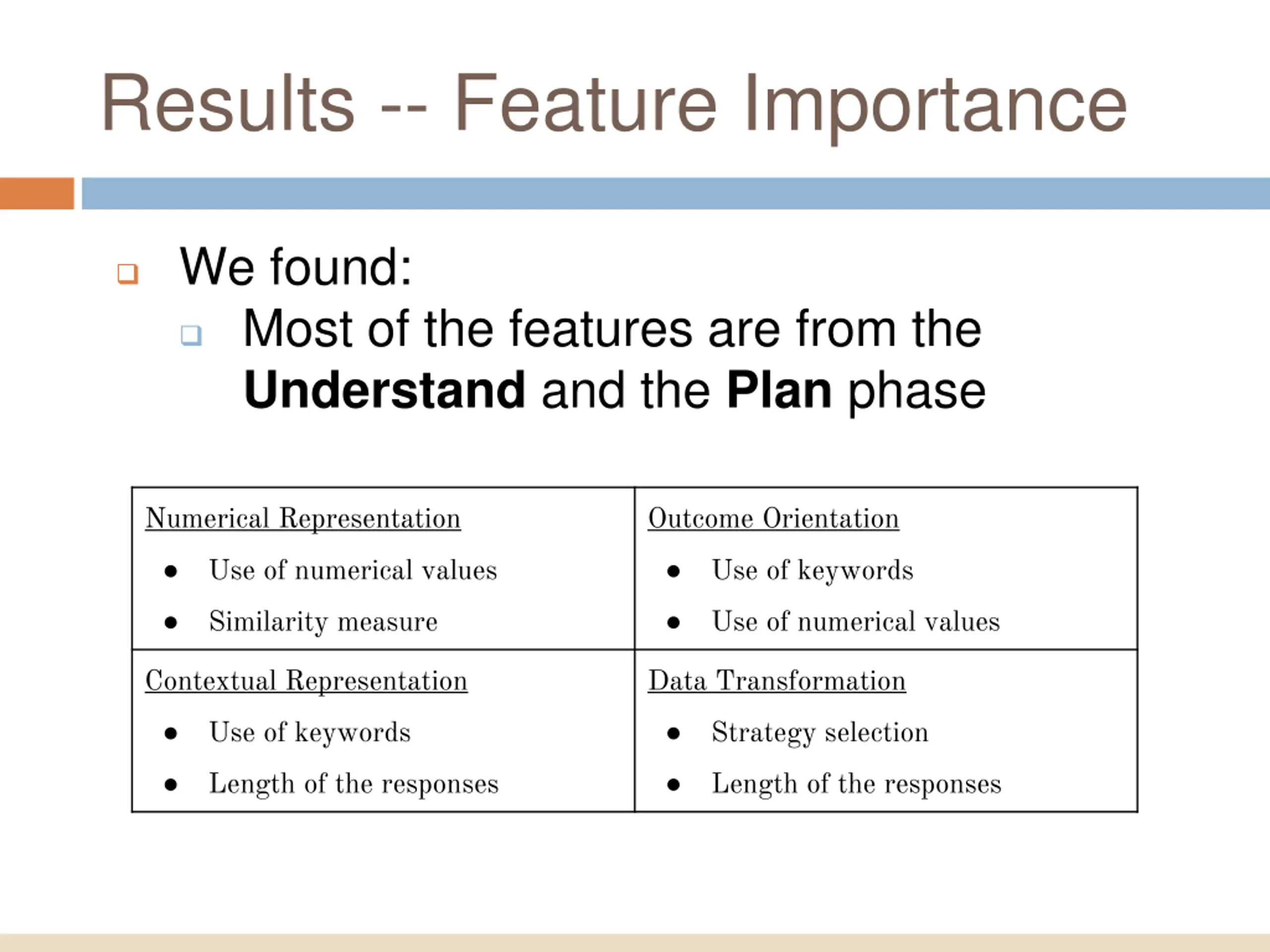 Results -- Feature Importance We found: Most of the features are from the Understand and the Plan phase Numerical Representation Outcome Orientation Use of numerical values Use of keywords Similarity measure Use of numerical values Contextual Representation Data Transformation Use of keywords Strategy selection Length of the responses Length of the responses