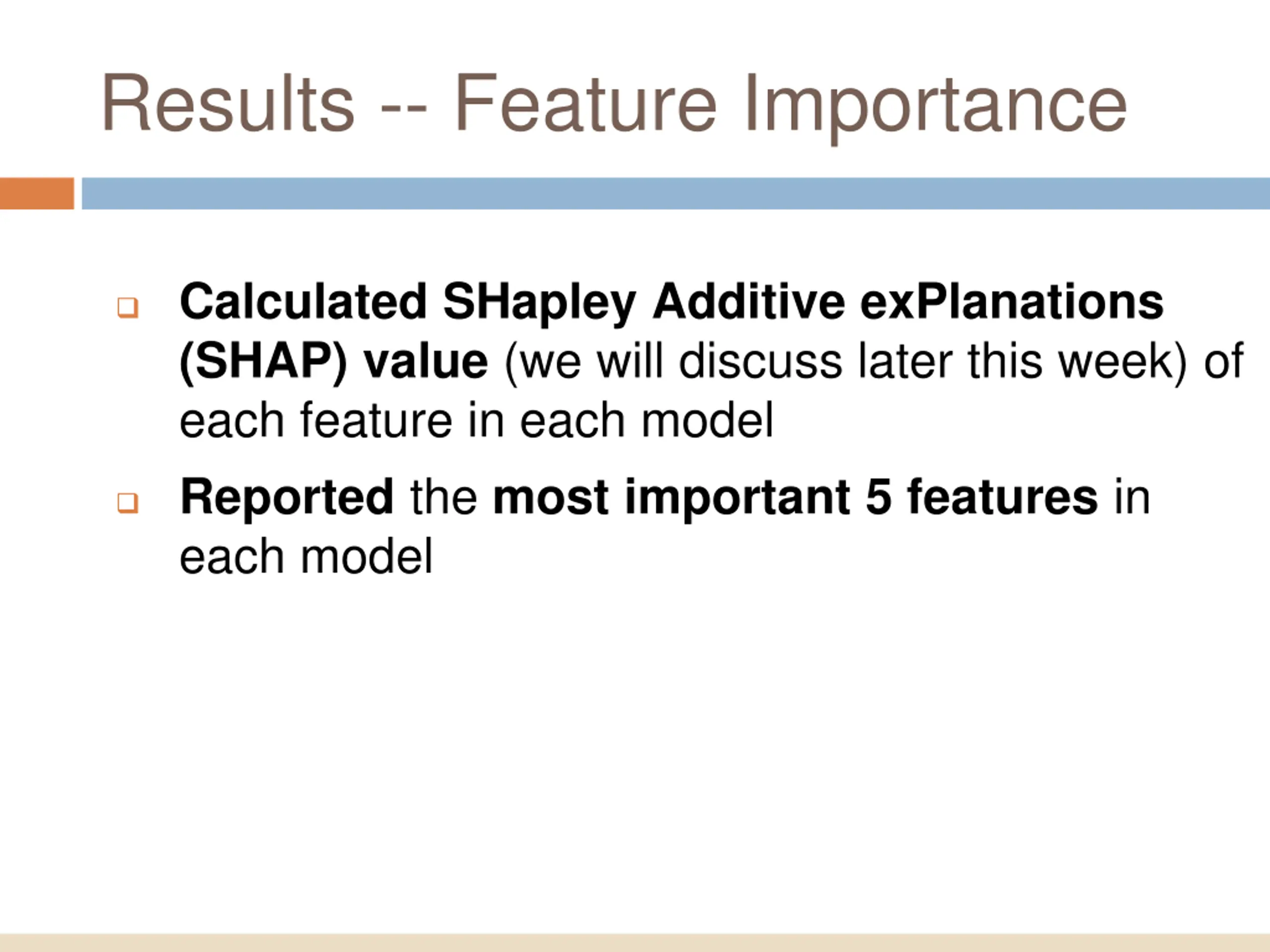 Results -- Feature Importance Calculated SHapley Additive exPlanations (SHAP) value (we will discuss later this week) of each feature in each model Reported the most important 5 features in each model